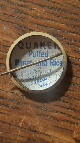 The front of the pin shows a classic color illustration of Carson in a cowboy hat. The back is clearly marked with the iconic Quaker marketing slogan: "QUAKER Puffed Wheat and Rice - SHOT FROM GUNS."
