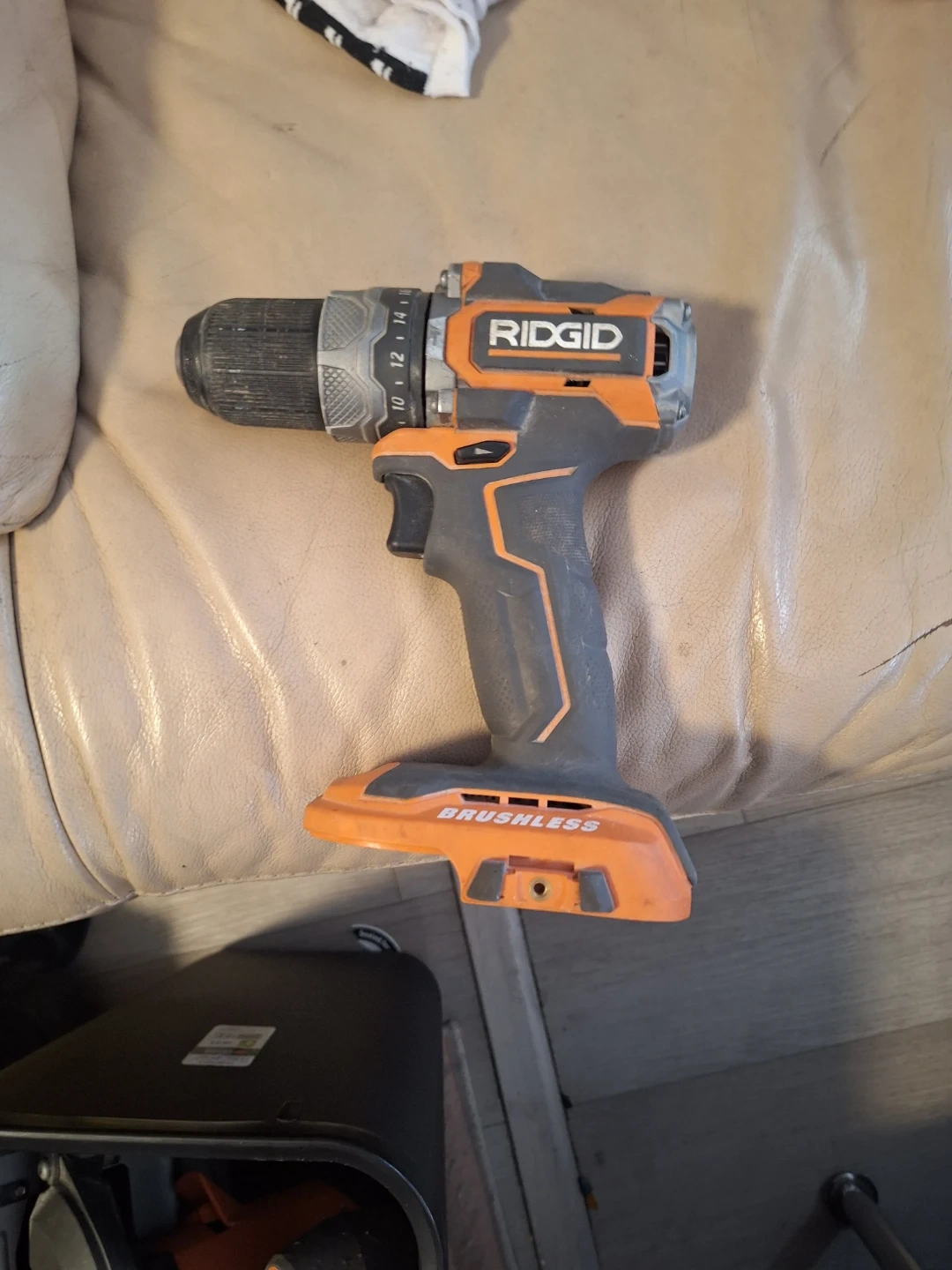 This is a RIDGID cordless drill with a brushless motor. It has a chuck with adjustable torque settings, indicated by numbers up to 14. It's orange and grey in colour.