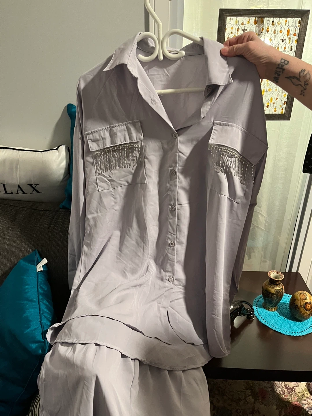 Cozy Hut2zie pajama set in a lovely lavender colour! This set is a size XXL and features a stylish design with embellished pockets. Perfect for a relaxing night in! The pants are smaller fitting slightly.