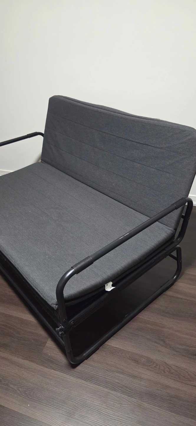 This is an IKEA Friheten sofa bed in grey. It's a versatile piece of furniture that easily converts from a sofa to a bed. The frame is made of metal and the upholstery is fabric.