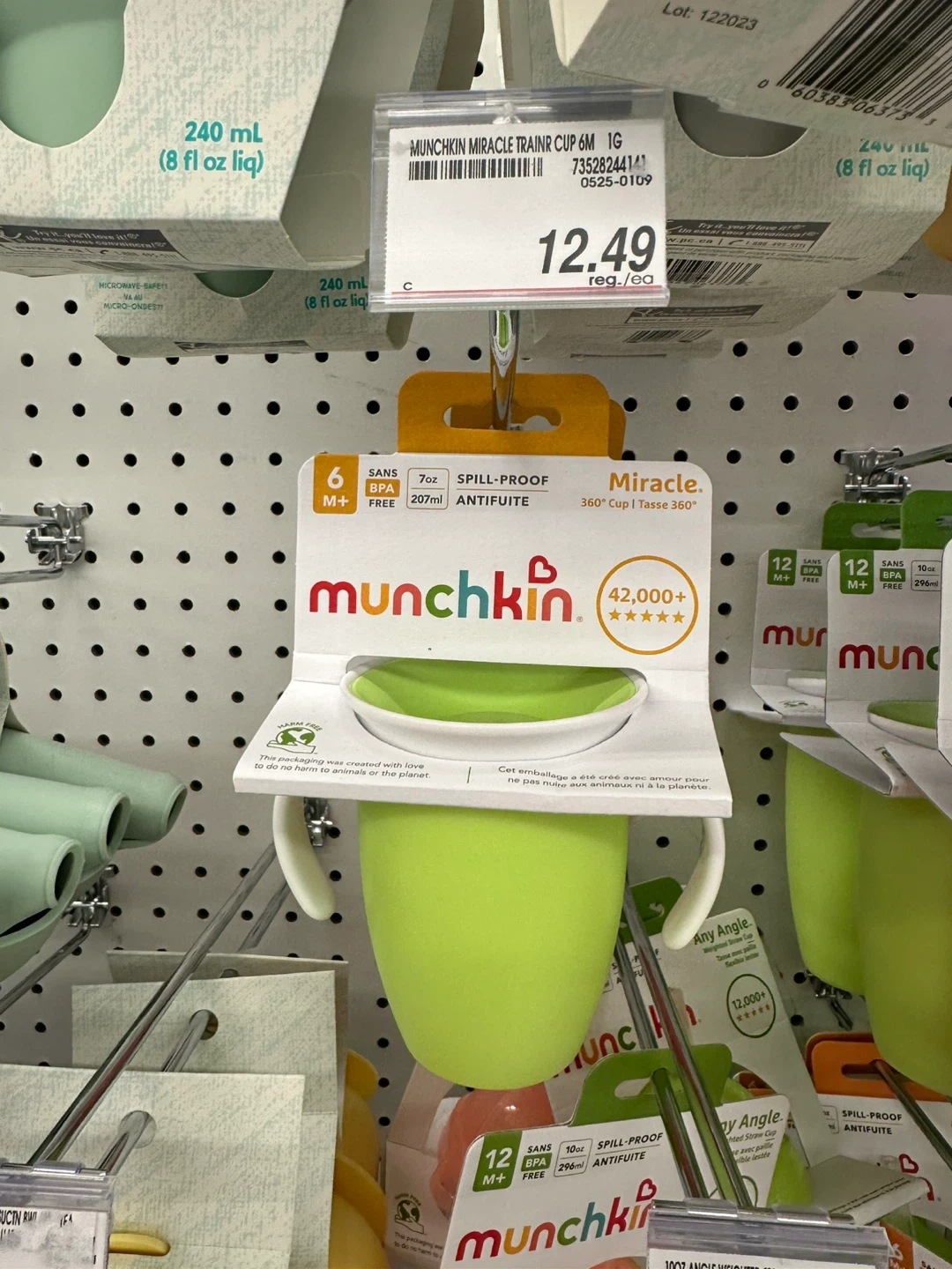 This is a Munchkin Miracle Trainr 360 Cup. It holds 240 mL (8 fl oz liq) and is spill-proof. It's BPA-free and suitable for ages 6 months and up.