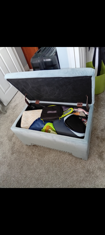 Here's a handy storage ottoman! It's in good condition and the perfect size for storing blankets, pillows, or anything else you need to tuck away