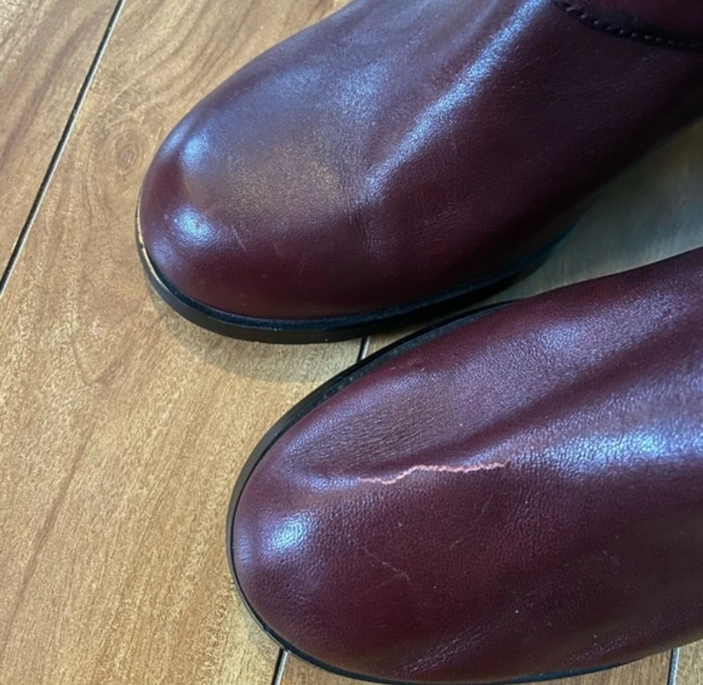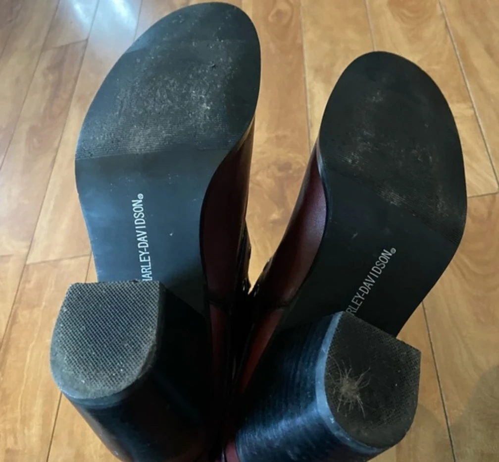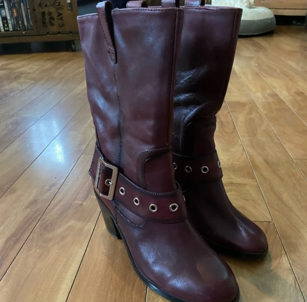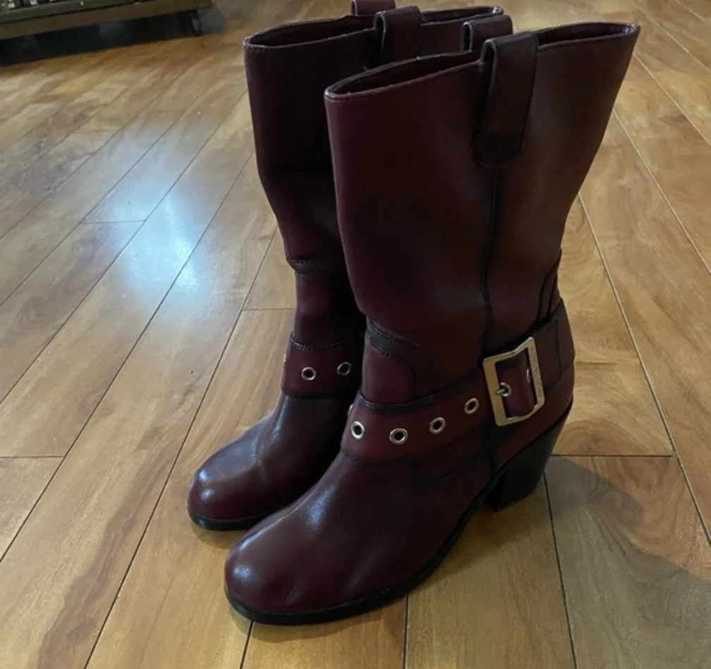 Harley Davidson heeled boots in a burgundy colour, size 7. These boots have a stylish buckle and eyelet design. There is a small scratch on one of the boots, as shown in the pictures. Otherwise, they are in good condition!