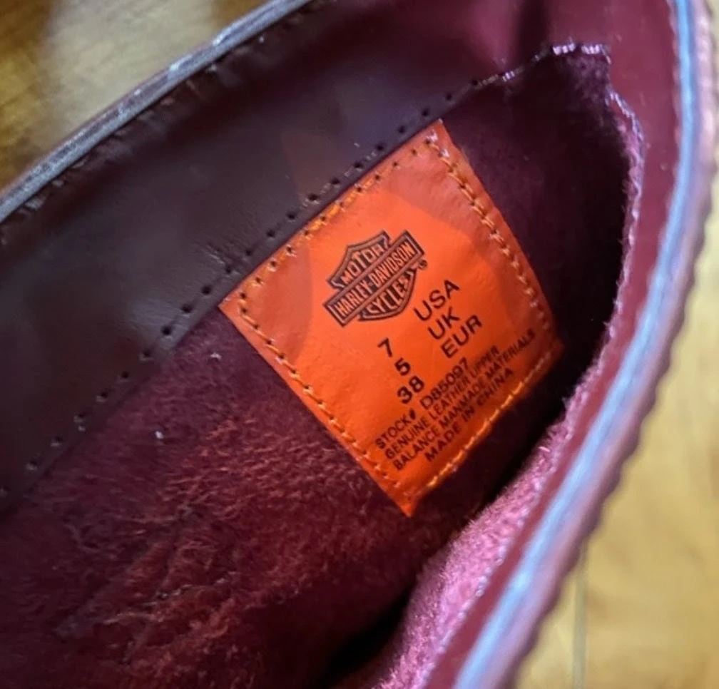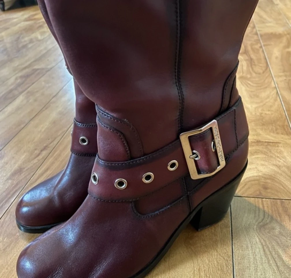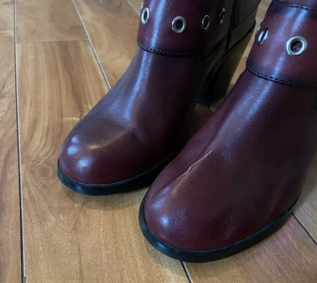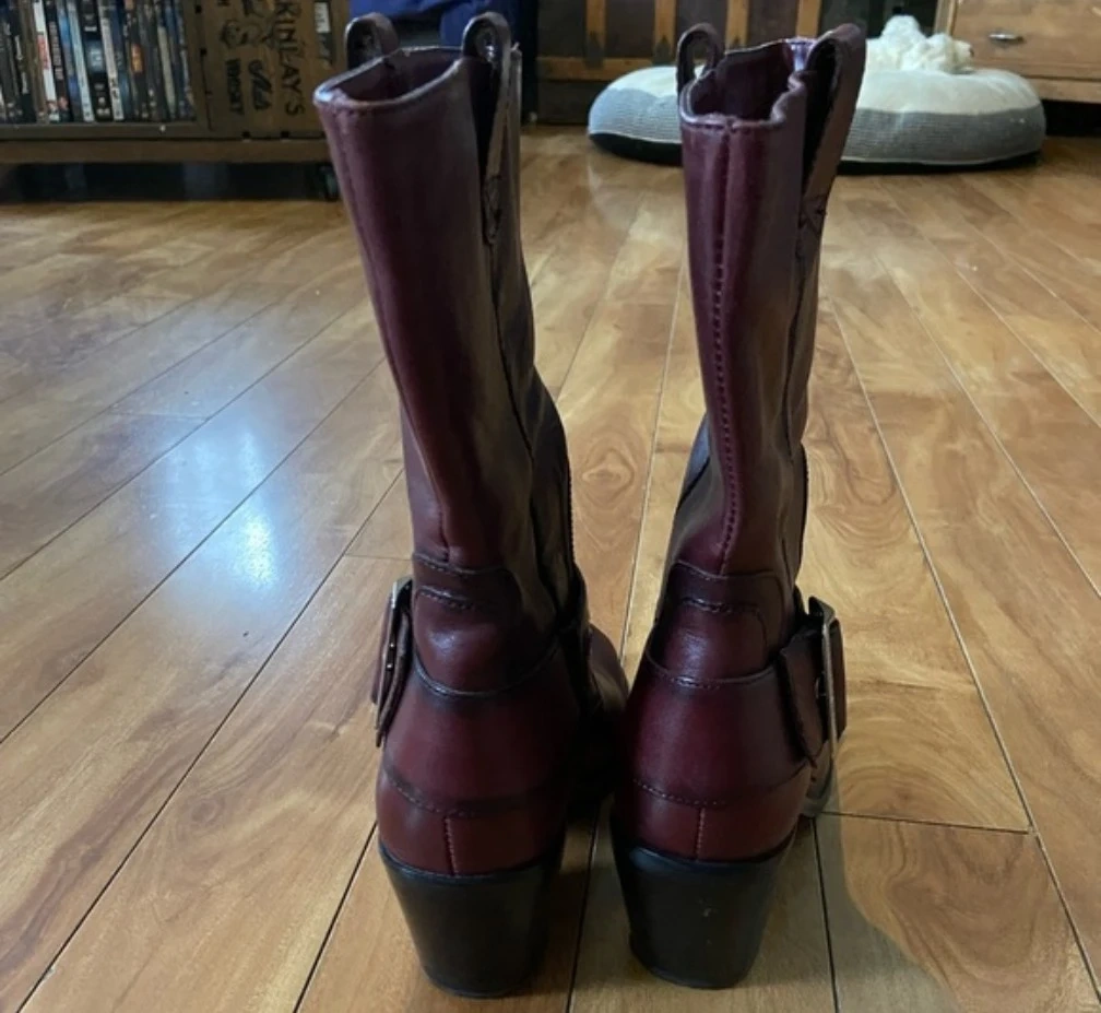 Harley Davidson heeled boots in a burgundy colour, size 7. These boots have a stylish buckle and eyelet design. There is a small scratch on one of the boots, as shown in the pictures. Otherwise, they are in good condition!
