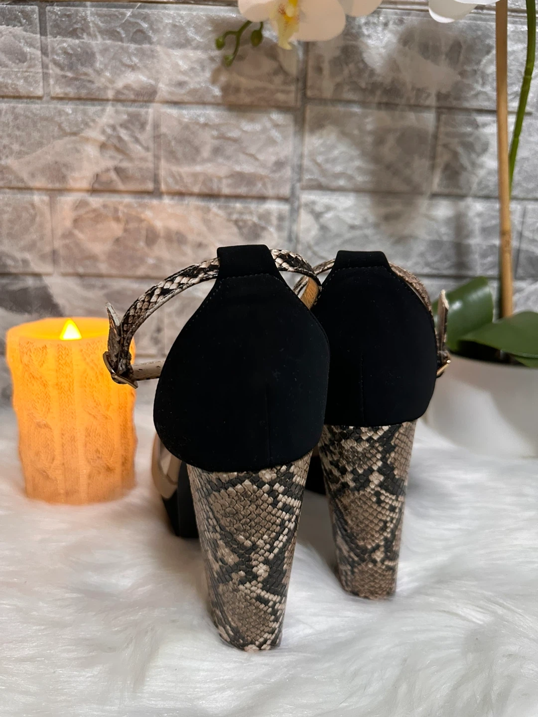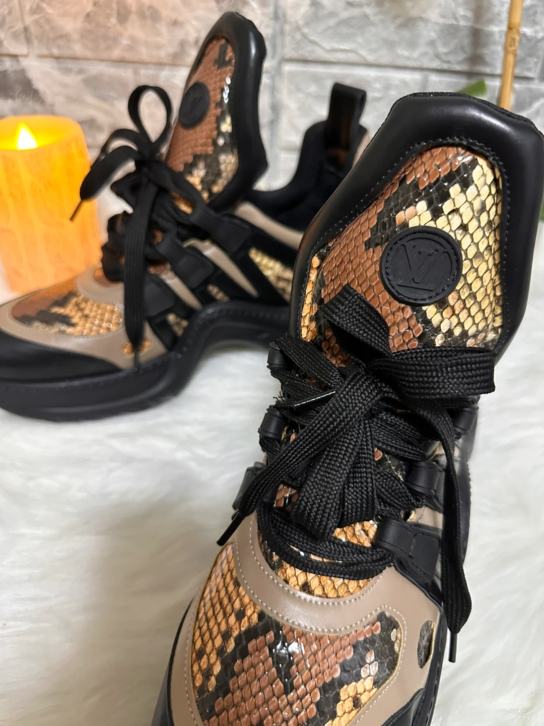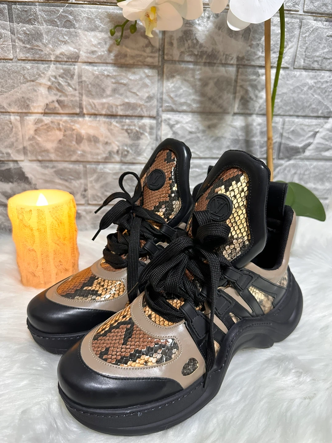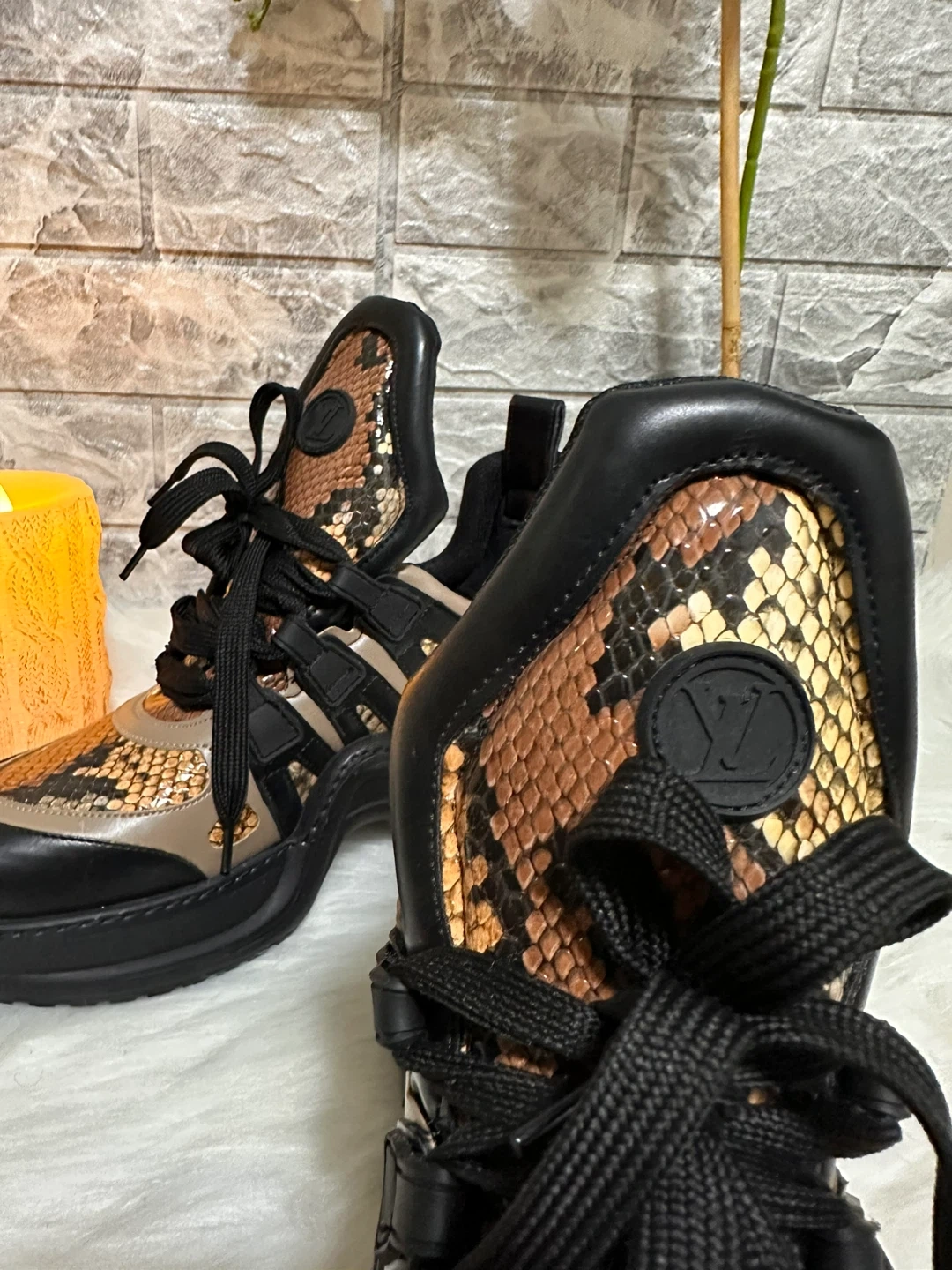 Stylish Louis Vuitton sneakers with snakeskin accents! These shoes feature a unique design with a blend of black and snakeskin patterns. They are in new condition and ready for a new home. Perfect for adding a touch of luxury to your everyday look!