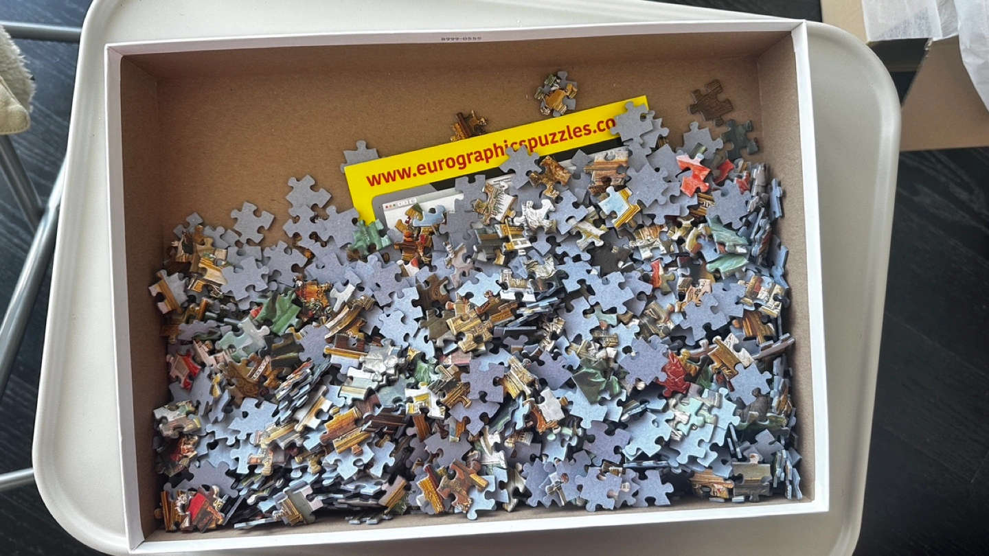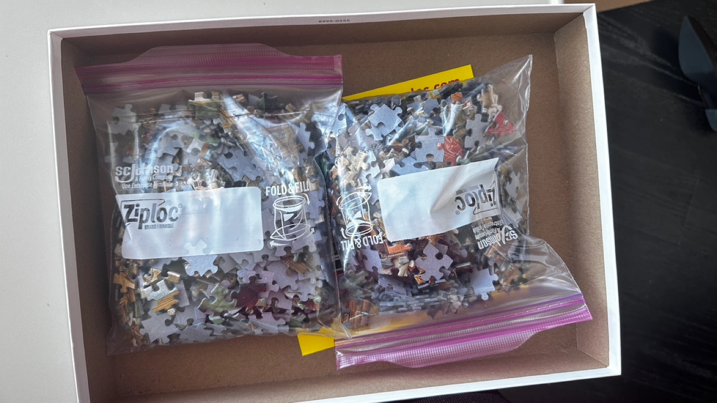 Uncompleted 1000-piece jigsaw puzzle. Image depicts a painting of an elaborate interior scene. Puzzle pieces are separated into two Ziploc bags. Includes original box.