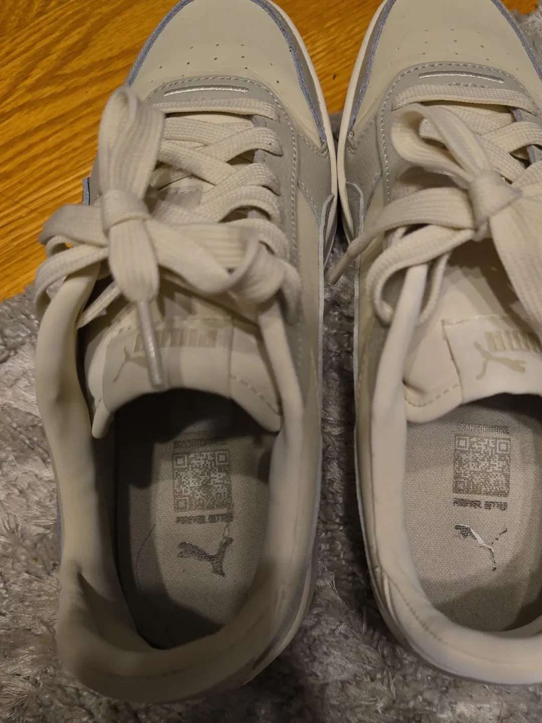 Cream-coloured Puma women's fashion sneakers. Lace-up style with a light grey trim. Rubber sole for comfort and durability. These shoes are perfect for everyday wear.