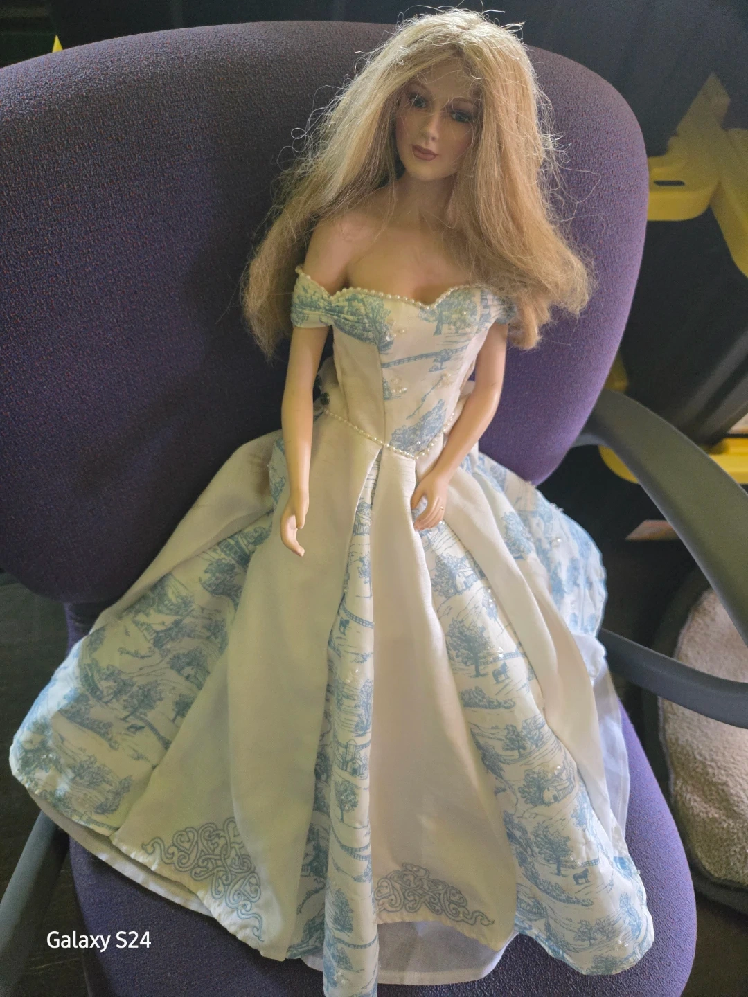 This is antique beautiful porcelain doll wearing an elaborate gown with a blue toile pattern. The dress features off-the-shoulder sleeves and delicate pearl beading along the neckline. It's a lovely decorative piece.