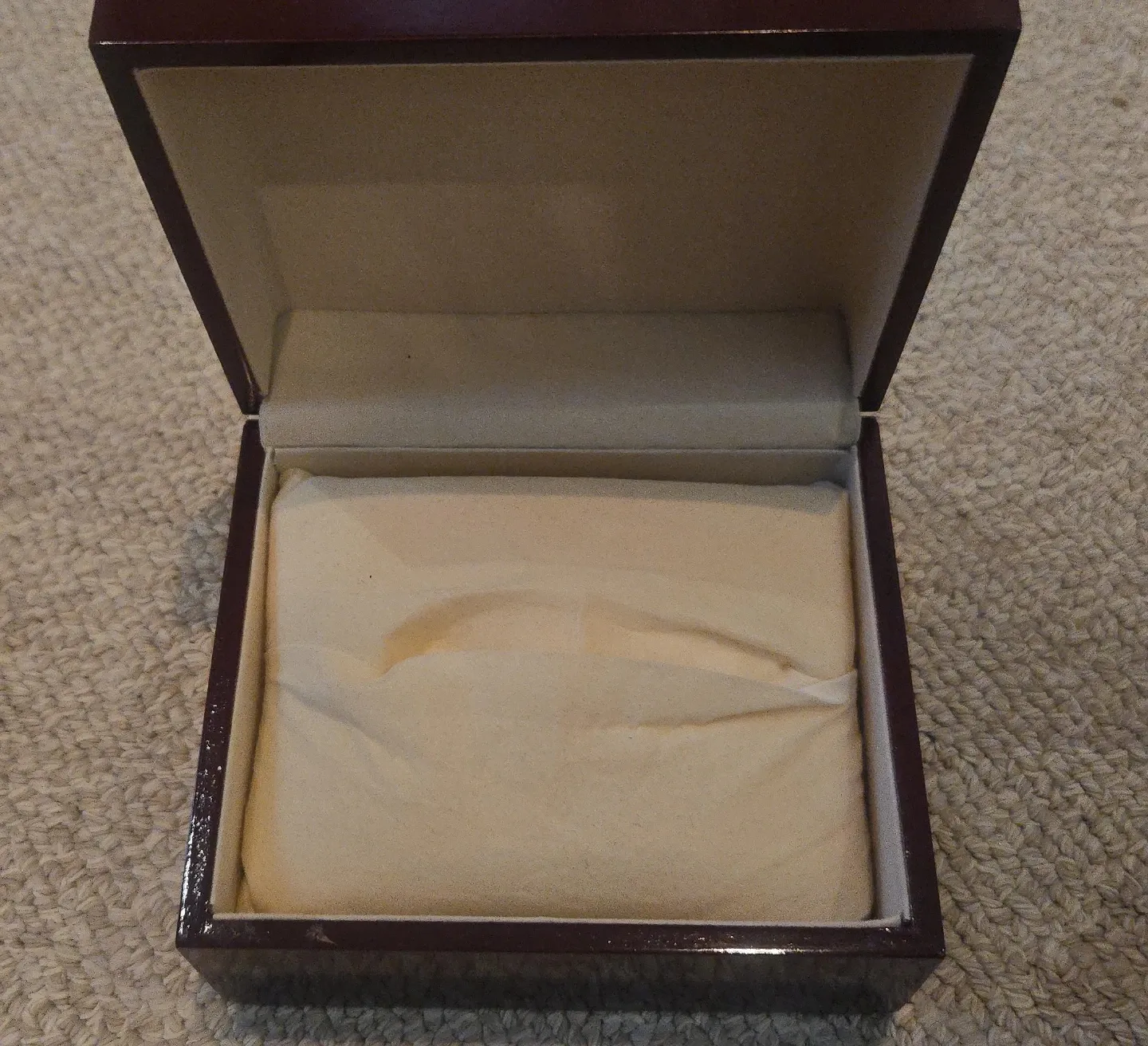 This is a dark brown, polished jewellery box. It's perfect for storing small trinkets or precious items. The interior is lined with a light-coloured fabric. Good for watches as well