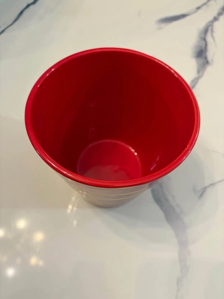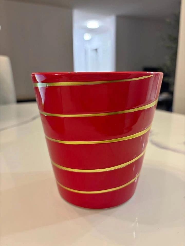 Festive red ceramic flower pot with elegant gold swirl detailing. Perfect for poinsettias, orchids, holiday greenery, or seasonal décor.