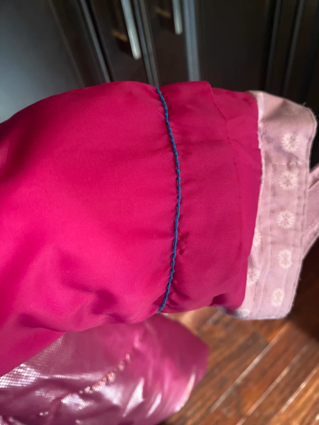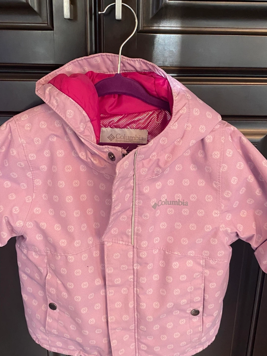Columbia ski jacket for toddlers in a fun pink polka dot pattern. It features an "Out-Grow" system to extend the cuffs for longer wear. Smoke free home.
