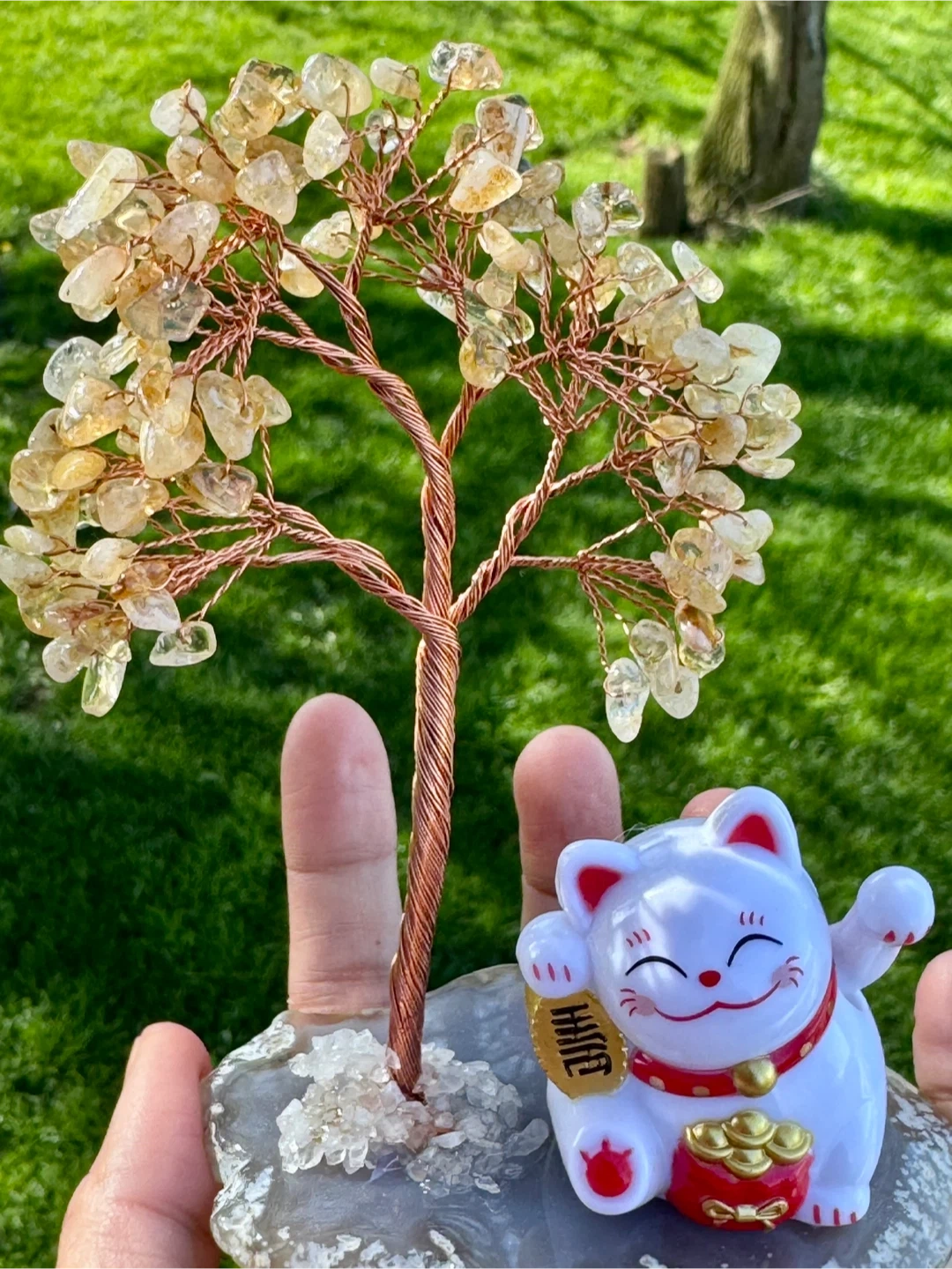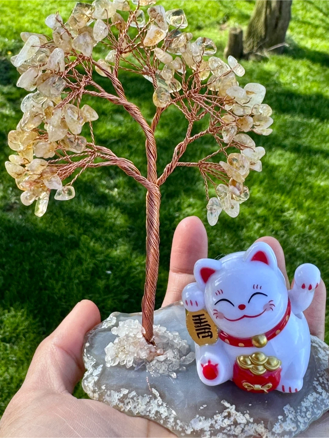 This decorative piece features a copper wire tree adorned with Citrine crystals, set on an agate base. It includes a small white Maneki Neko cat figurine holding a coin. A lovely addition to any shelf or desk!