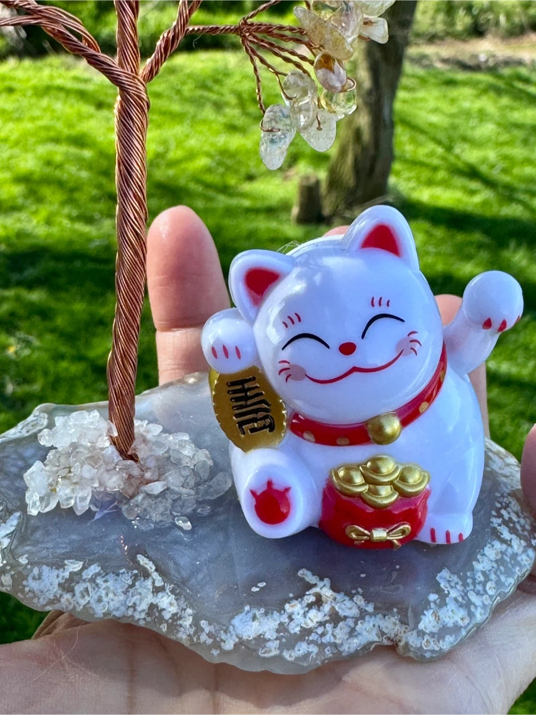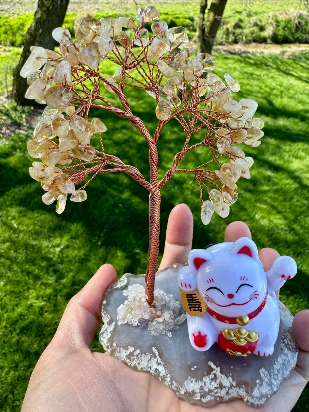 This decorative piece features a copper wire tree adorned with Citrine crystals, set on an agate base. It includes a small white Maneki Neko cat figurine holding a coin. A lovely addition to any shelf or desk!