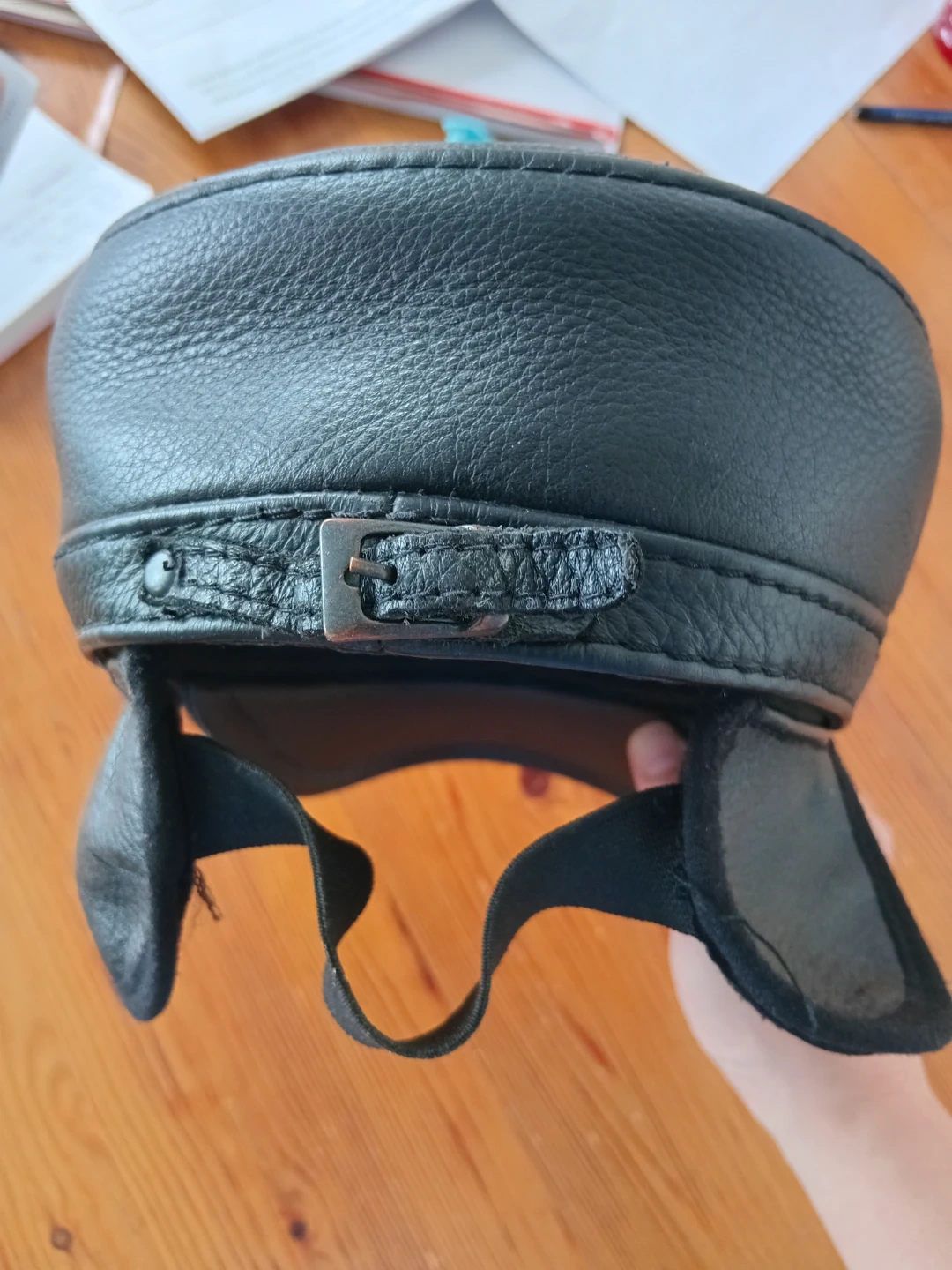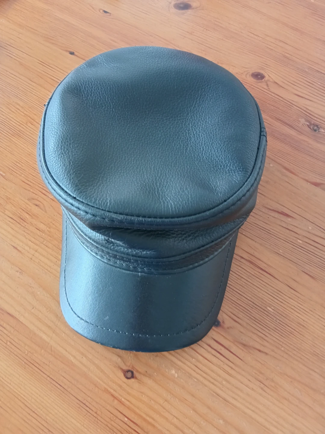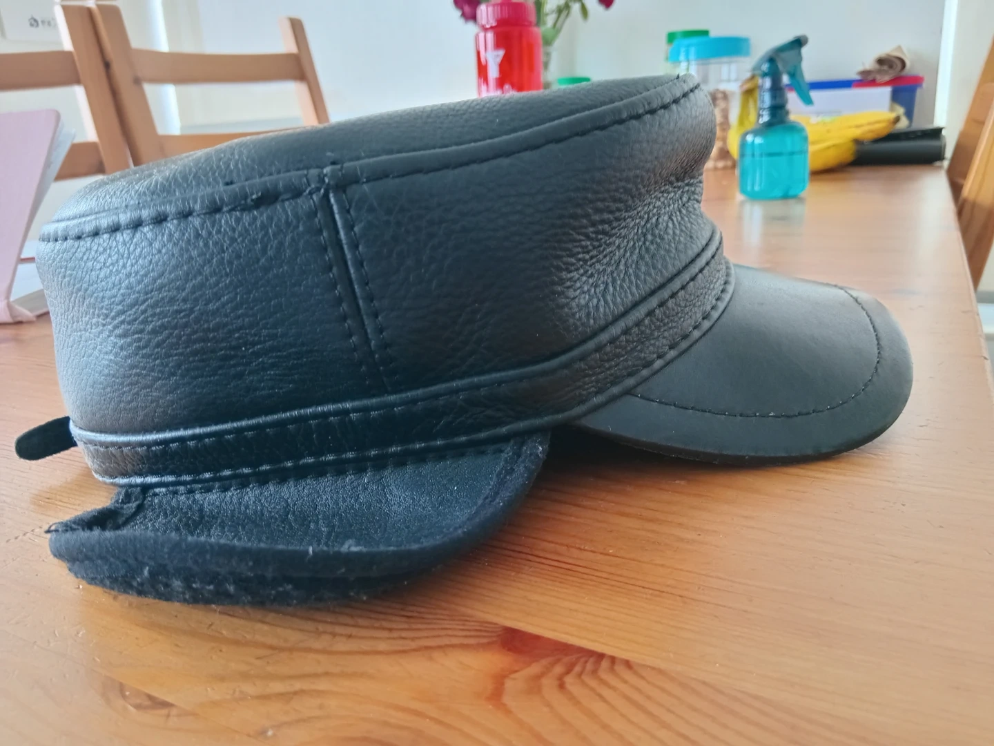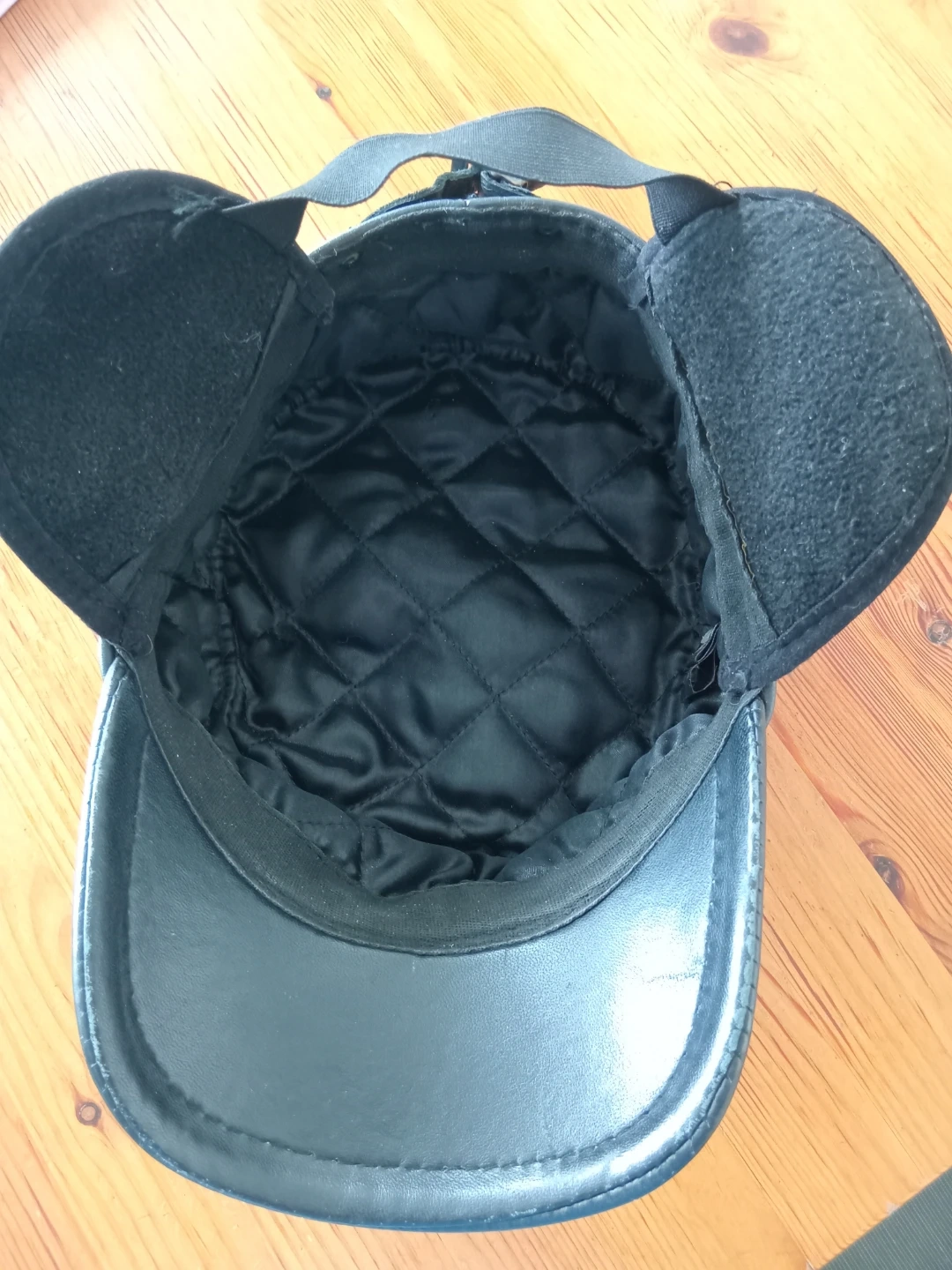 This black cap is made of leather and features a military-inspired design. It includes ear flaps that can be secured with a buckle. The inside is lined with quilted satin for comfort. It's a stylish accessory for cooler weather!