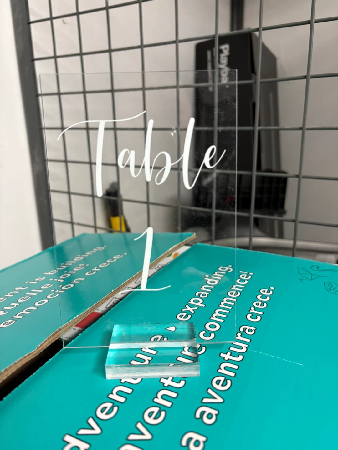 Clear acrylic table number sign. Features a modern calligraphy "Table" with a bold numeral. Made of durable acrylic for easy cleaning and long-lasting use.