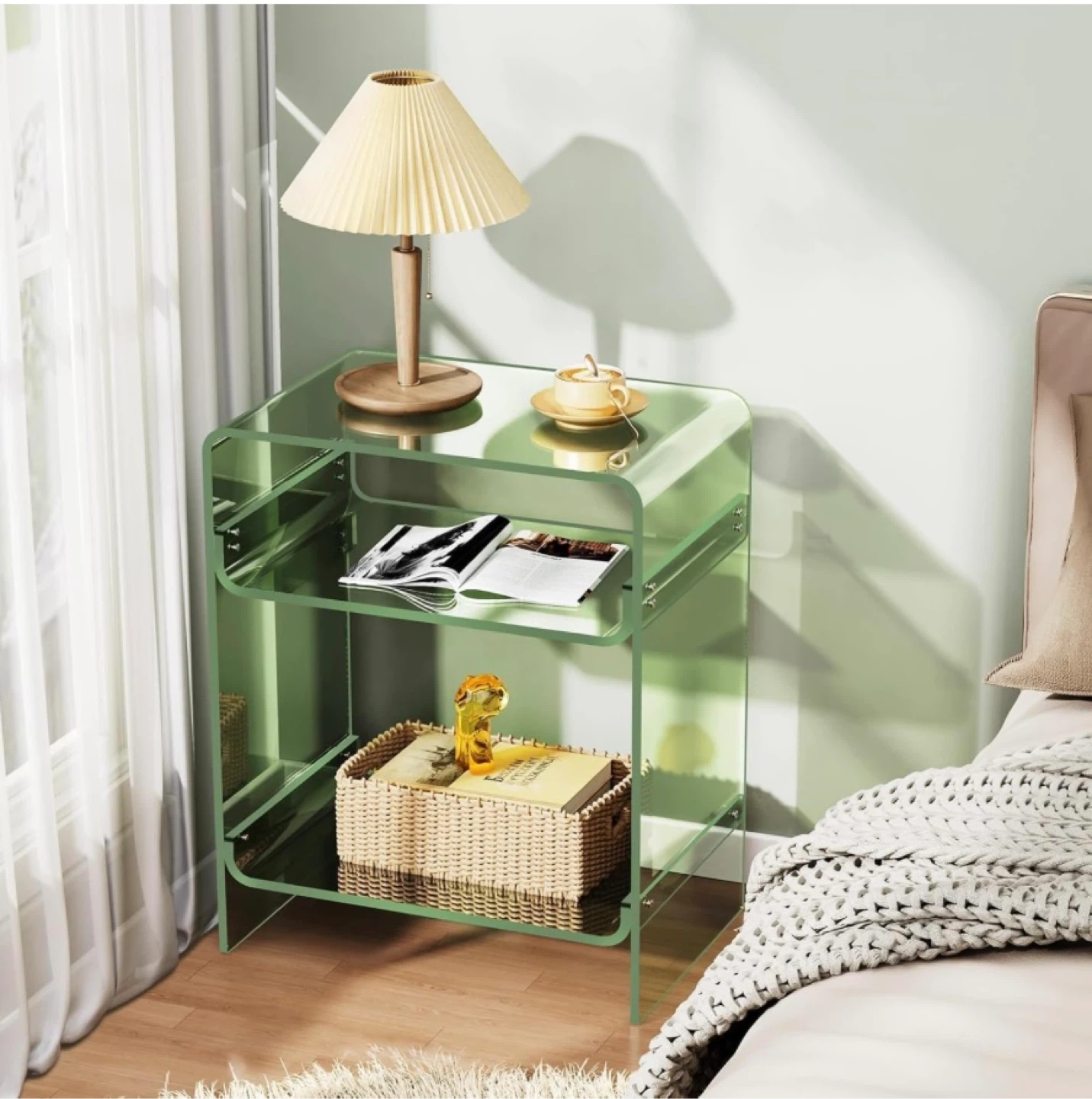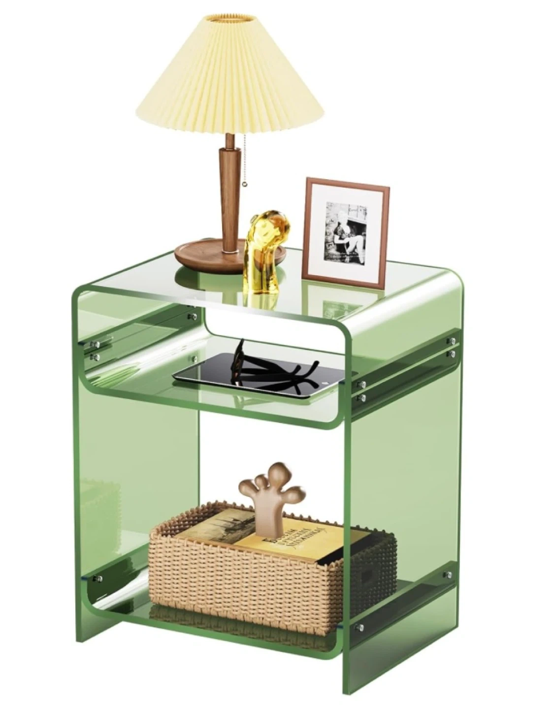 Brighten up your space with this brand new, green acrylic side table, featuring a modern design with two shelves, perfect for adding a pop of colour and functionality to any room. Never taken out of the box, this unique piece is ready to assemble and become a stylish addition to your home decor!