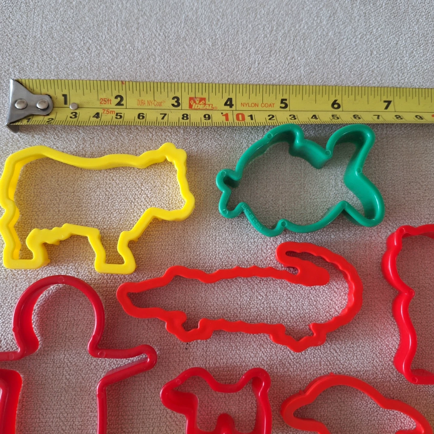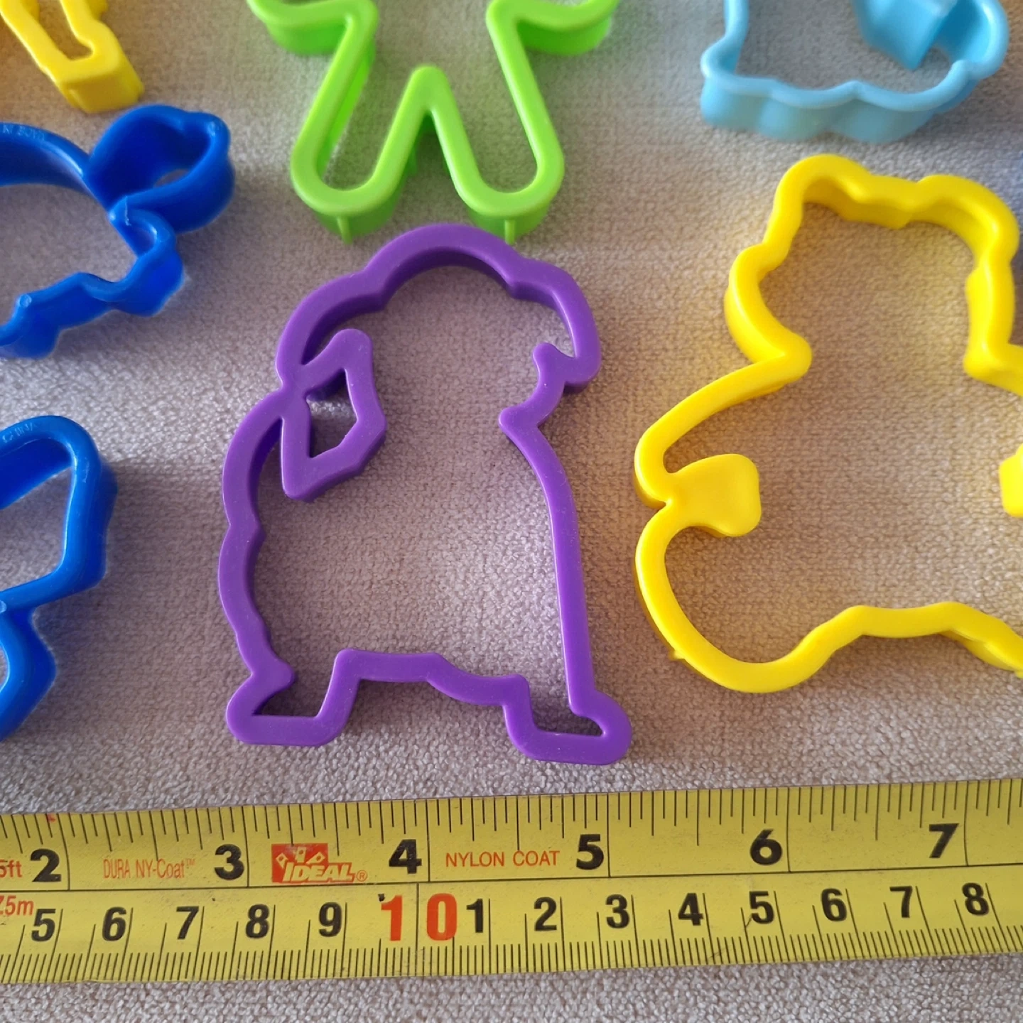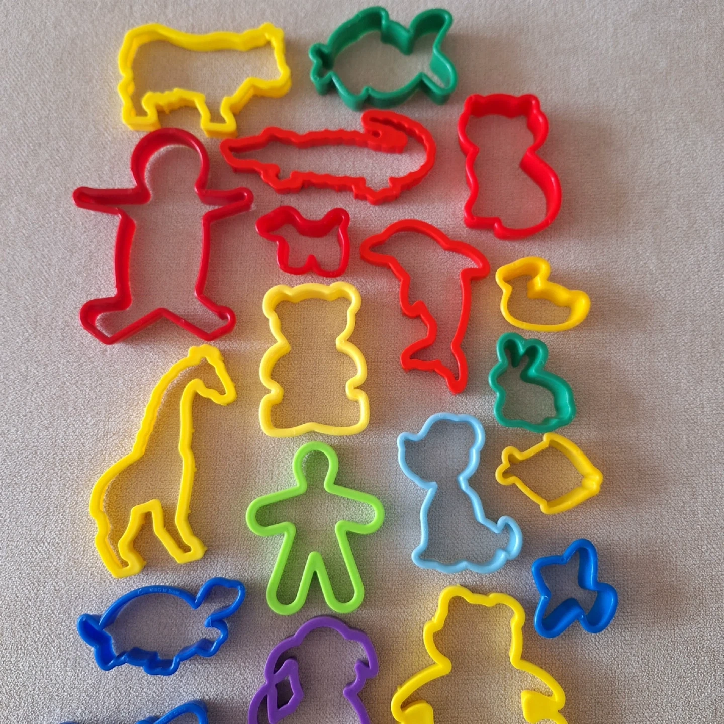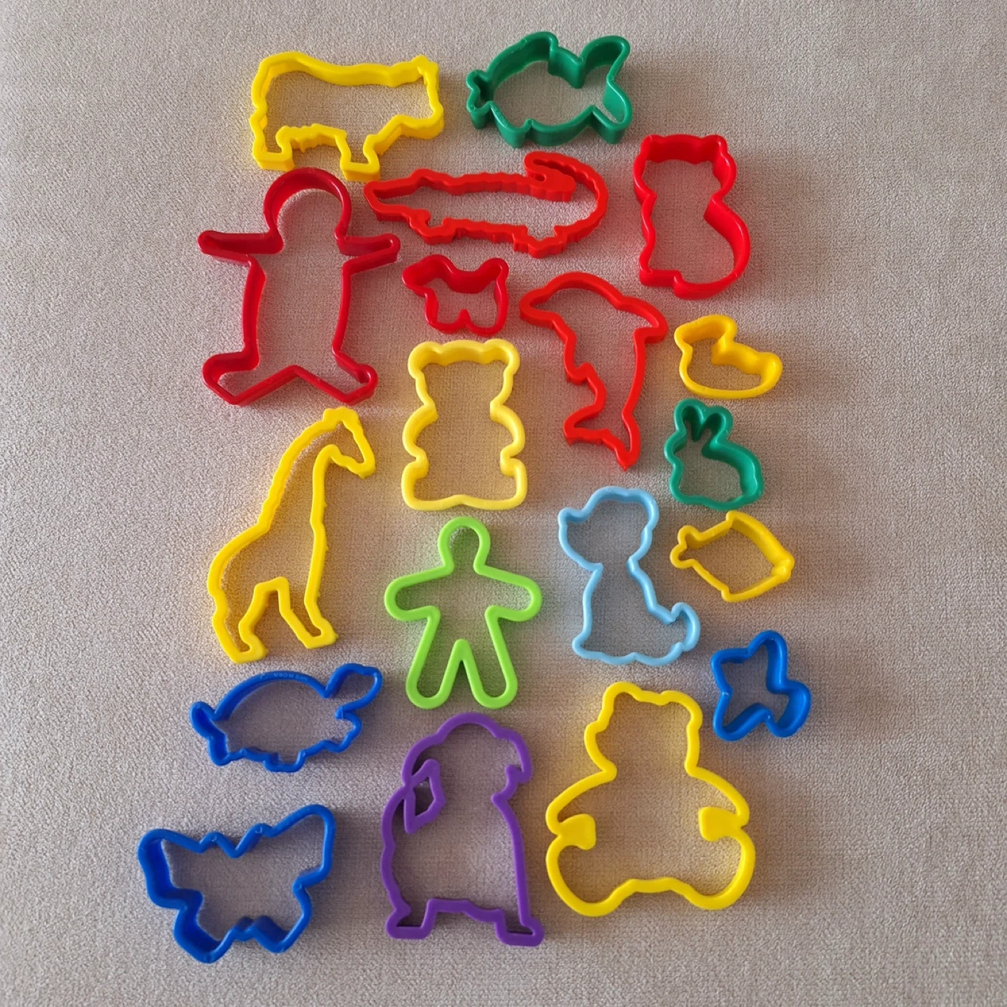 A fun set of 17 plastic cookie cutters in various animal and figure shapes. Includes a giraffe, bear, dolphin, dog, alligator, bunny, turtle, and more! Plastic material. Great for playdoo as well