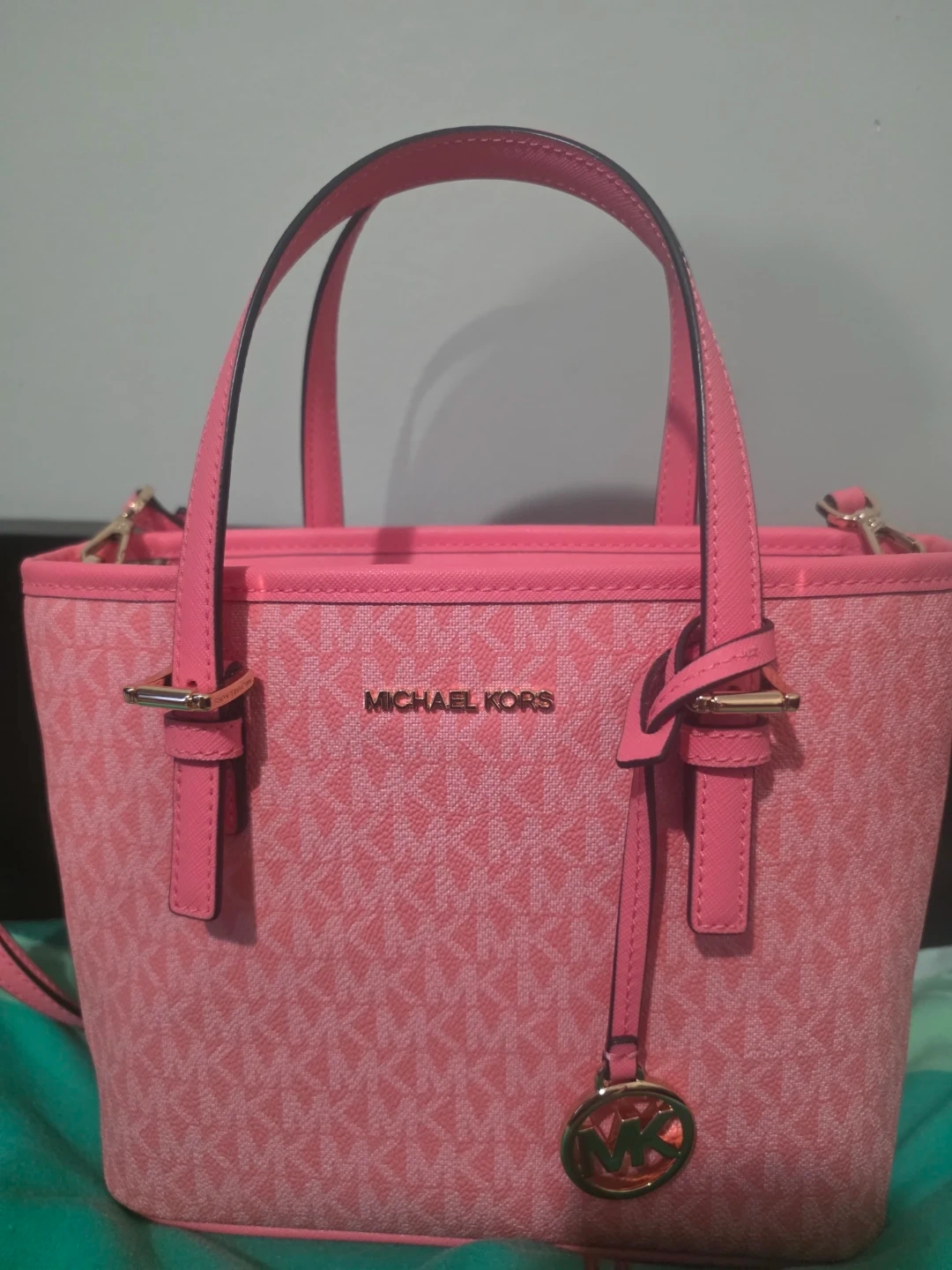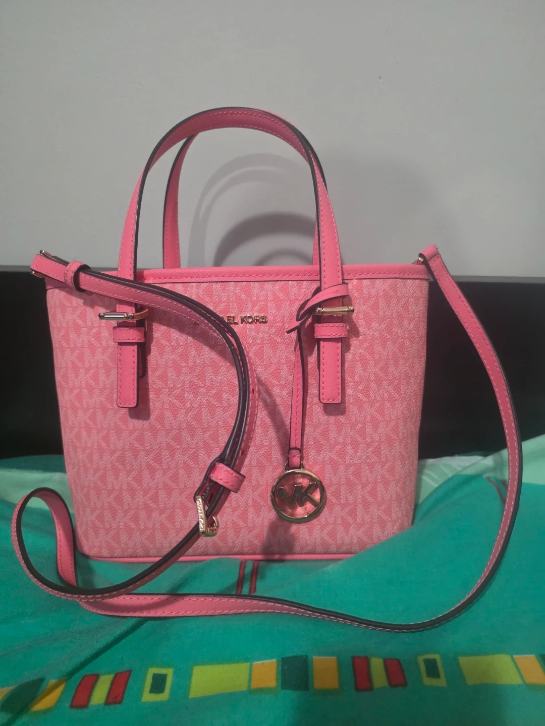 This is a cute pink Michael Kors tote bag! It's in great condition and perfect for everyday use. The bag features the classic MK logo pattern all over.