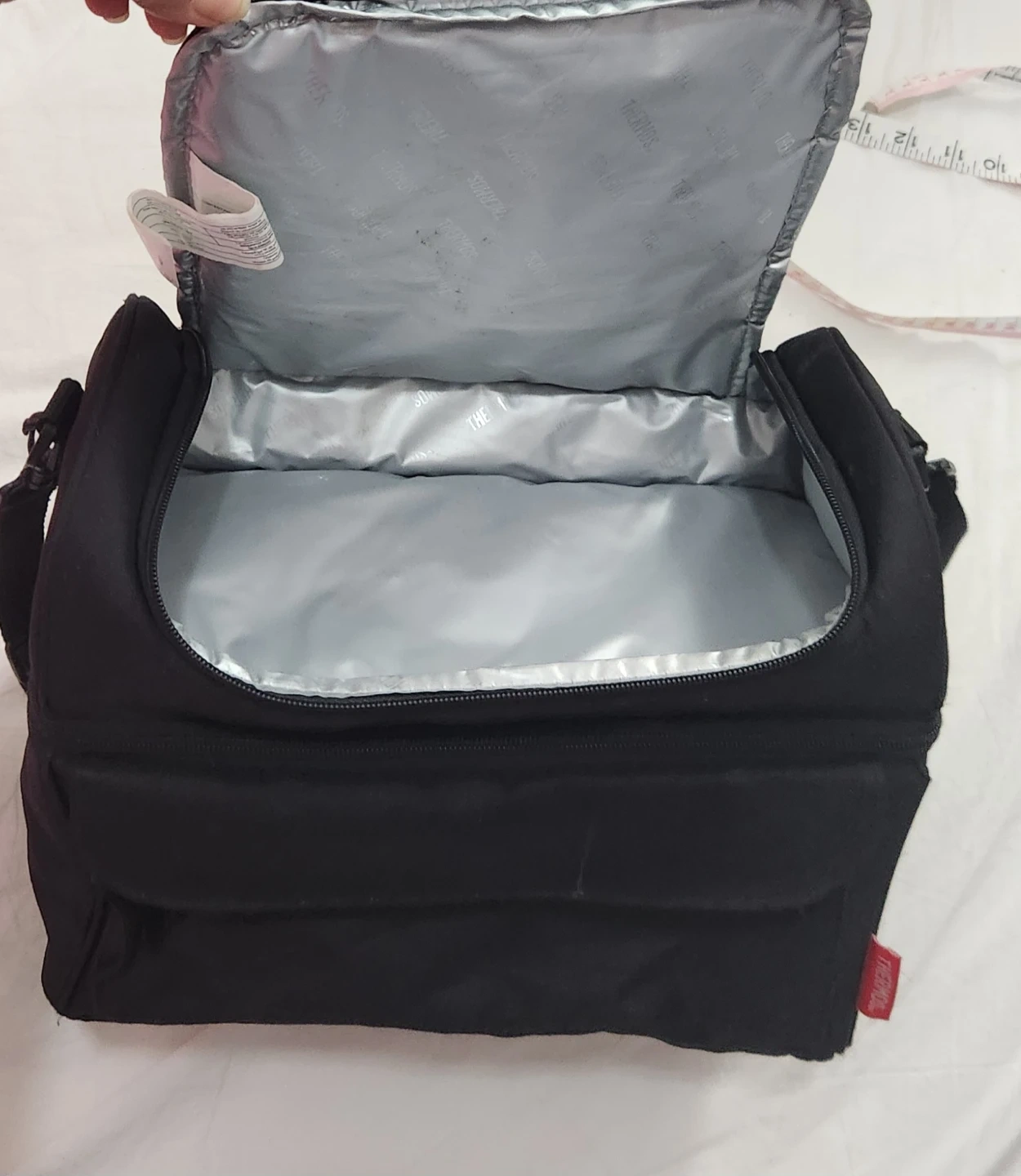 This is a black Thermos insulated lunch bag. It's made of durable fabric with a zippered main compartment. Interior is insulated to keep food and drinks cool.