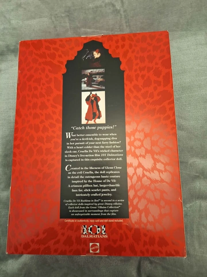 Brand new Cruella De Vil doll from 101 Dalmatians Great Villains Collection. Doll has blonde hair and blue eyes, wearing red dress with black fur coat. Comes with original packaging and stand.
