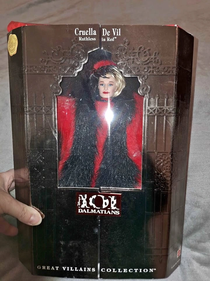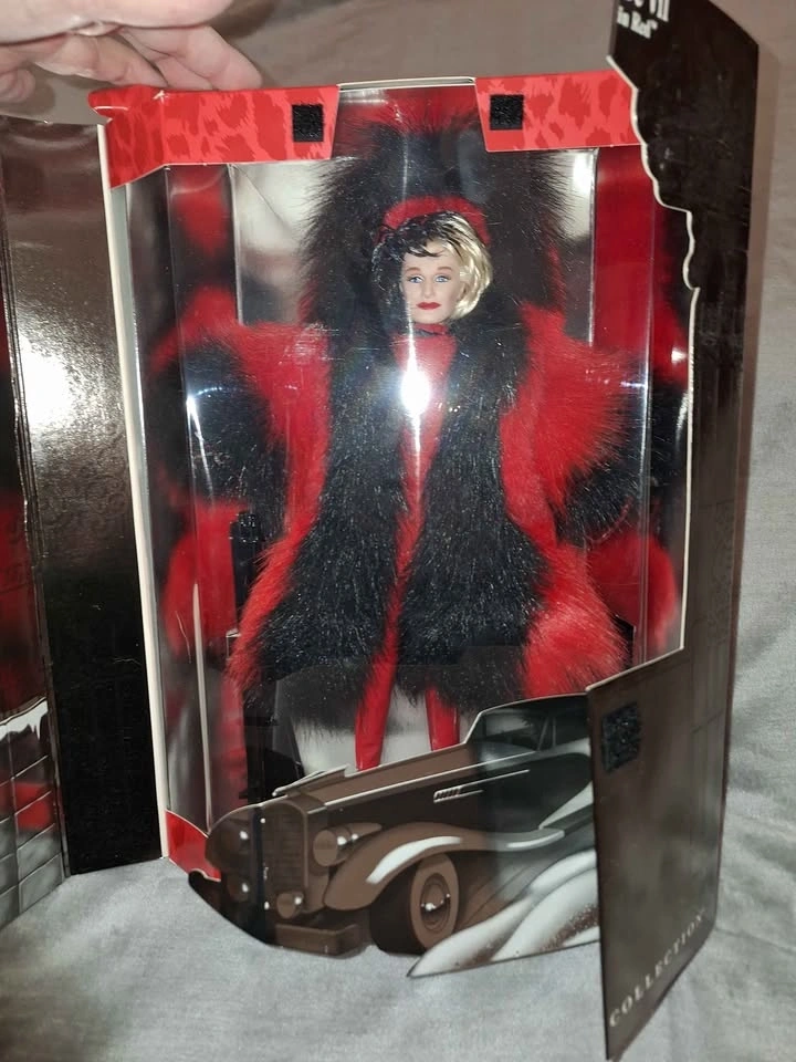 Brand new Cruella De Vil doll from 101 Dalmatians Great Villains Collection. Doll has blonde hair and blue eyes, wearing red dress with black fur coat. Comes with original packaging and stand.