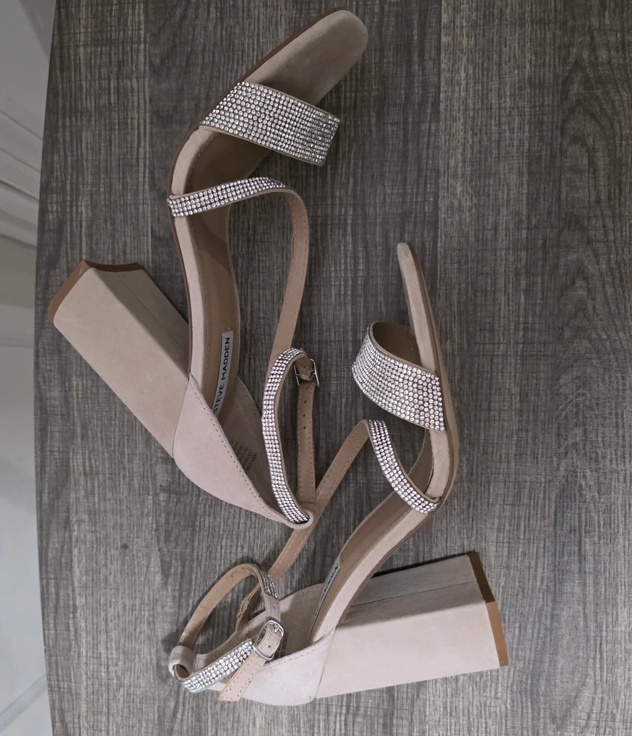 These Steve Madden block heel sandals feature a chic beige suede-like material adorned with sparkling rhinestones across the straps. The adjustable ankle strap ensures a secure fit. A stylish choice for dressing up any outfit!