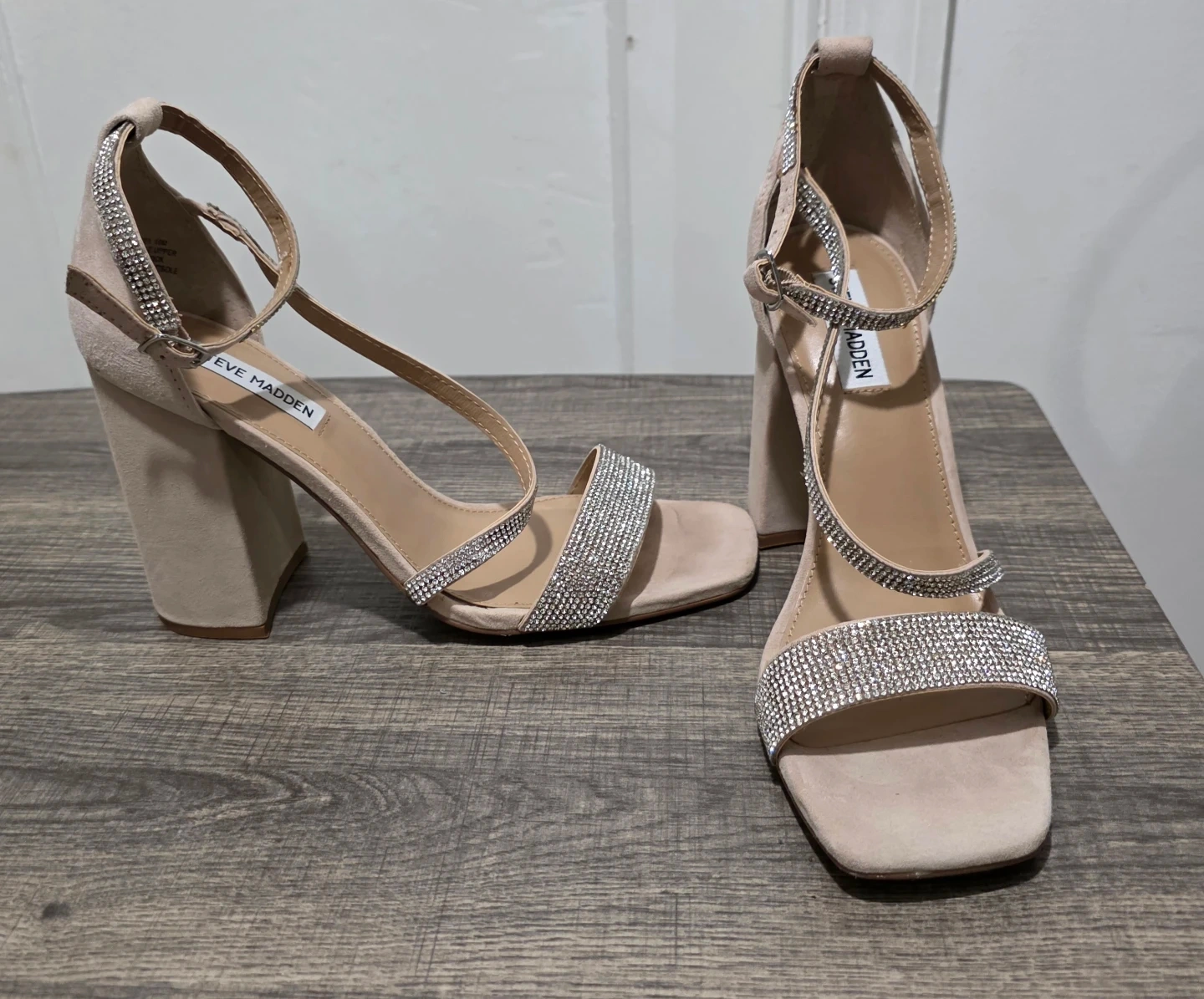 These Steve Madden block heel sandals feature a chic beige suede-like material adorned with sparkling rhinestones across the straps. The adjustable ankle strap ensures a secure fit. A stylish choice for dressing up any outfit!