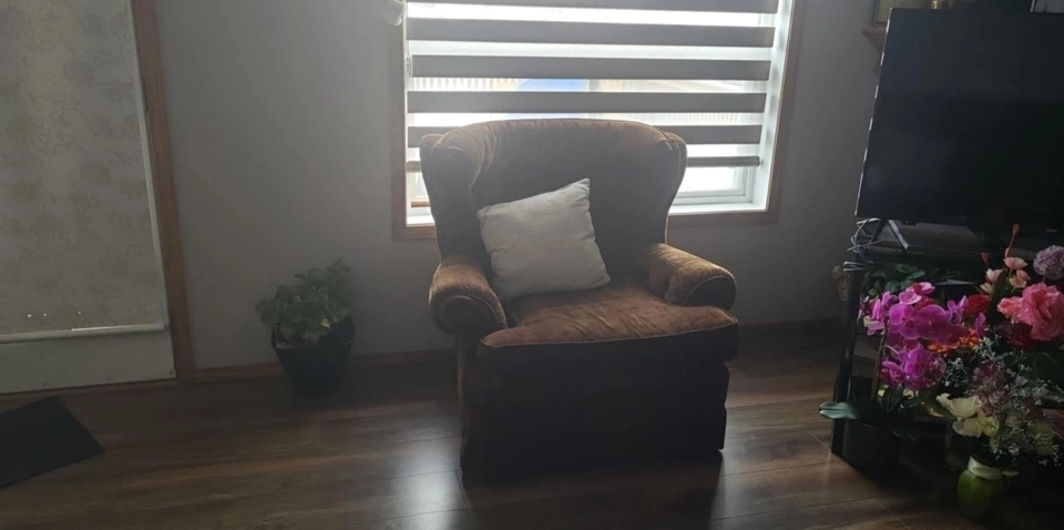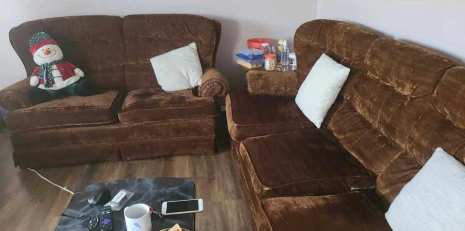 Brown velvet sofa and loveseat set. Includes two throw pillows. The sofa has a snowman decoration on the arm.