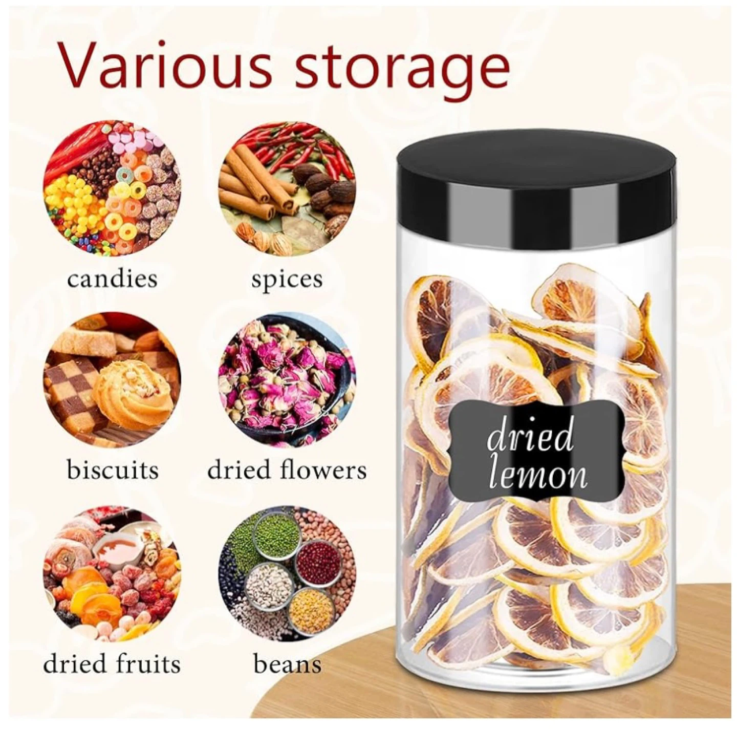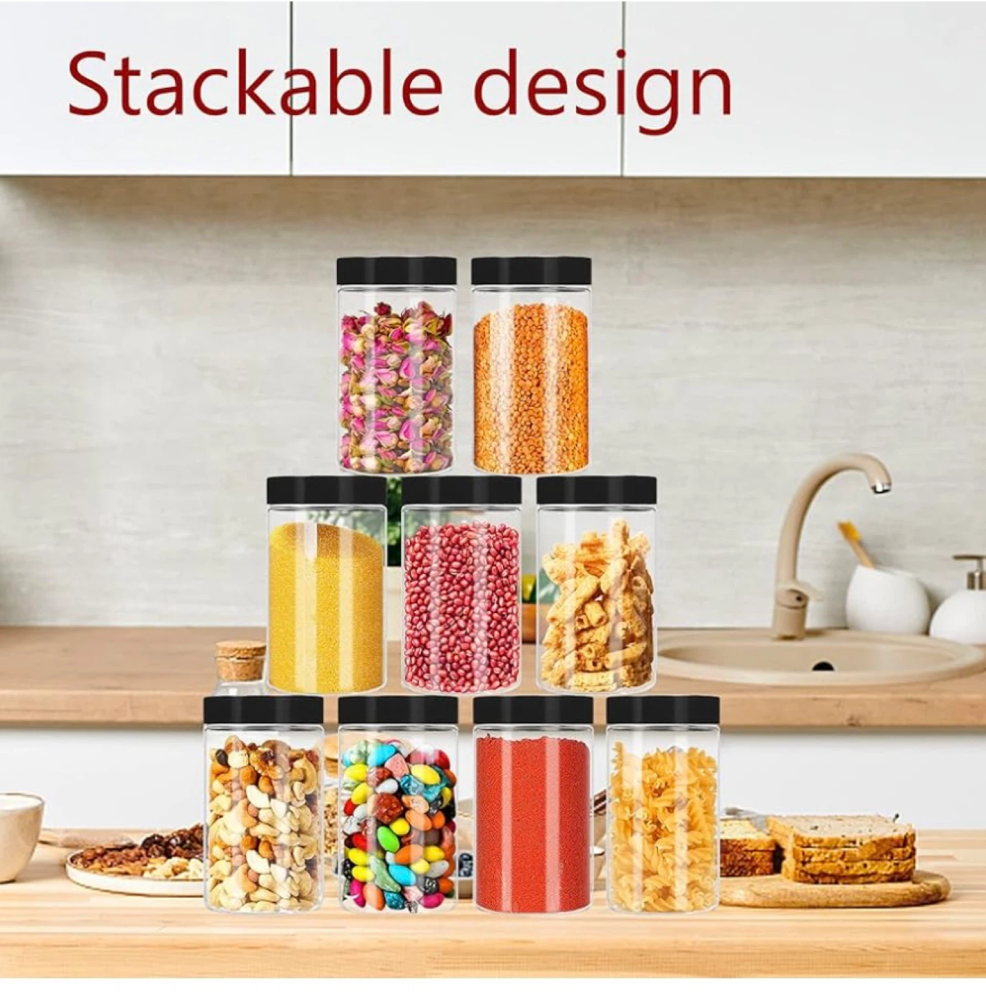 These clear plastic jars are perfect for storing dry goods like candies, spices, biscuits, dried flowers, beans, and nuts. They feature a stackable design for efficient storage. Each jar has a 14oz capacity and includes a wide mouth for easy access and cleaning. You also get 20 rewritable stickers.