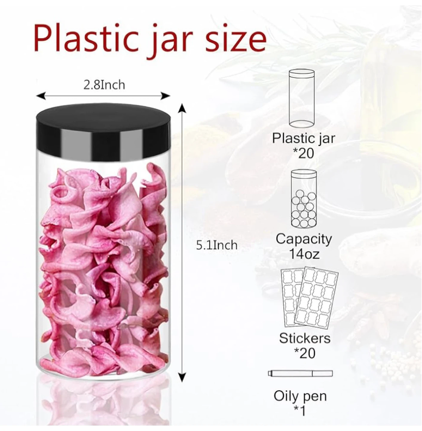 Set of 20 Clear Plastic Storage Jars with Lids and Stickers