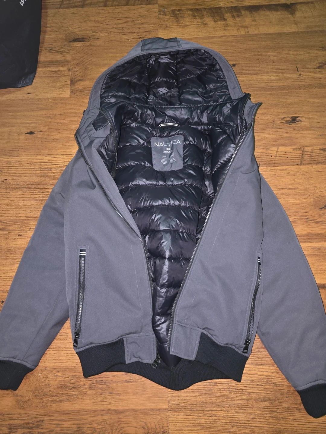 Selling a Nautica grey puffer jacket in size medium. It's in great condition and ready to keep you warm! The jacket features a stylish design with a comfortable fit, perfect for those chilly Canadian days. It has a hood and zipper pockets.