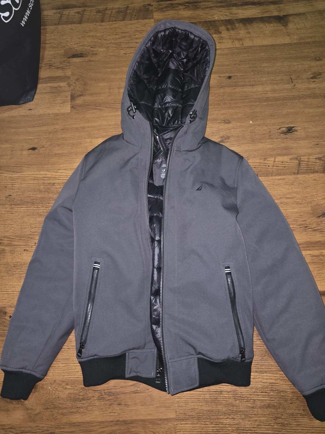 Selling a Nautica grey puffer jacket in size medium. It's in great condition and ready to keep you warm! The jacket features a stylish design with a comfortable fit, perfect for those chilly Canadian days. It has a hood and zipper pockets.