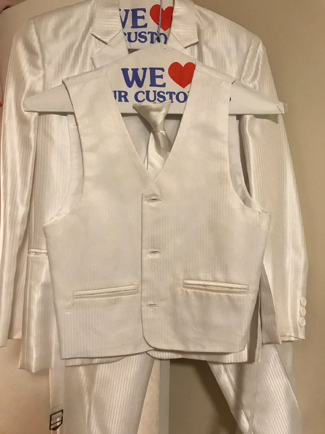 Buy & SellWhite Suit, Vest, and TieWhite Suit, Vest, and Tie$135This is a white suit set including a jacket, vest, and tie. The fabric has a subtle pinstripe pattern. It's a classic choice for formal events.Size8-9 years (boys)WHERE TO MEETCheck LocationView MapSELLERverifiedNicole2021 Merchants Gate600 reviews0 chats·0 favorites·15 viewsSEND CHAT TO SELLERHi Nicole! I’m interested in your listing.Hi Nicole! I’m interested in your listing.Get the Karrot app to chatSign In to chat