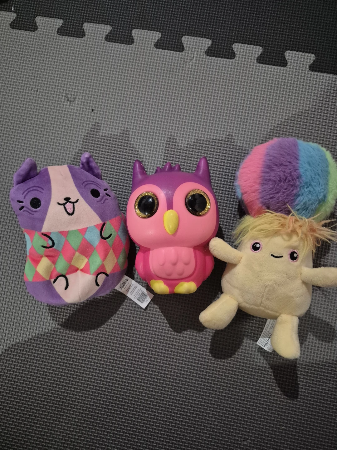 This bundle includes a purple cat plush with a diamond pattern, a bright pink owl plush with large glittery eyes, and a small yellow fuzzy character toy. They're all soft and ready for playtime!