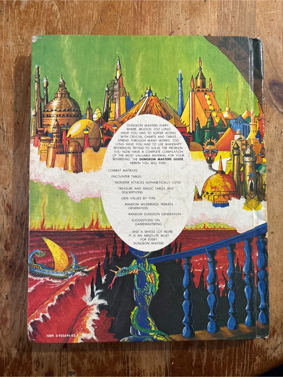 This is the Advanced Dungeons & Dragons Dungeon Master's Guide. It contains essential reference information for gamemastering Advanced D&D. It includes combat matrices, monster attacks, treasure tables, and descriptions.
