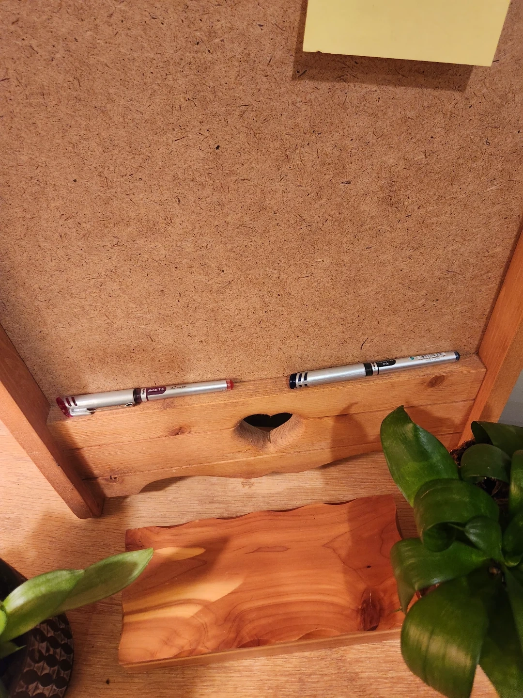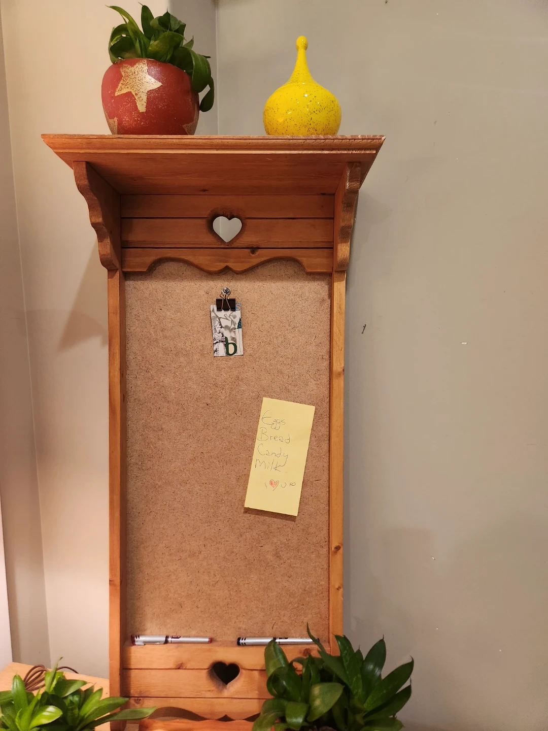 Super cute homemade wooden wall organizer with a little shelf on top! It has classic cottage core vibes with heart cutout details. Space to hold pens. Key peg and post it note surface. Top shelf display for plants or storage bssket is pretty and practical and perfect for keeping your notes and reminders organized! Shelf surface 17.5x8 organizer is 36 inches high.
