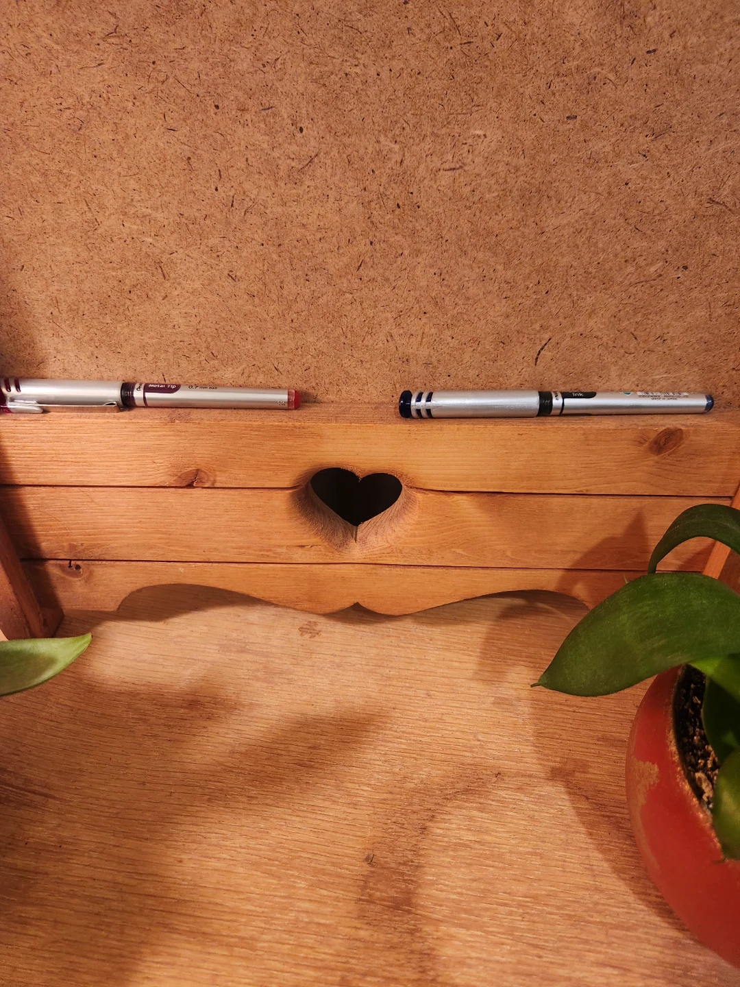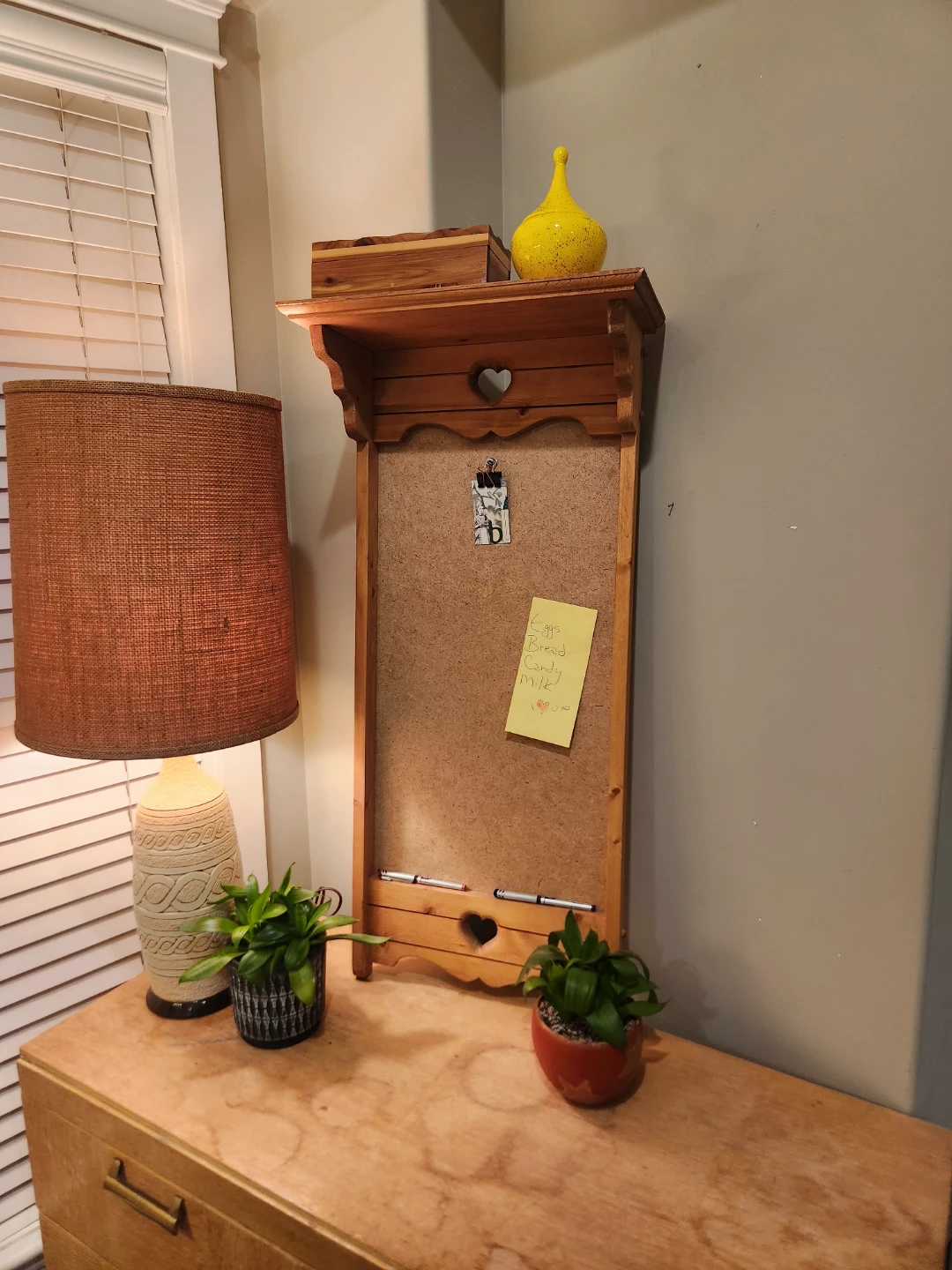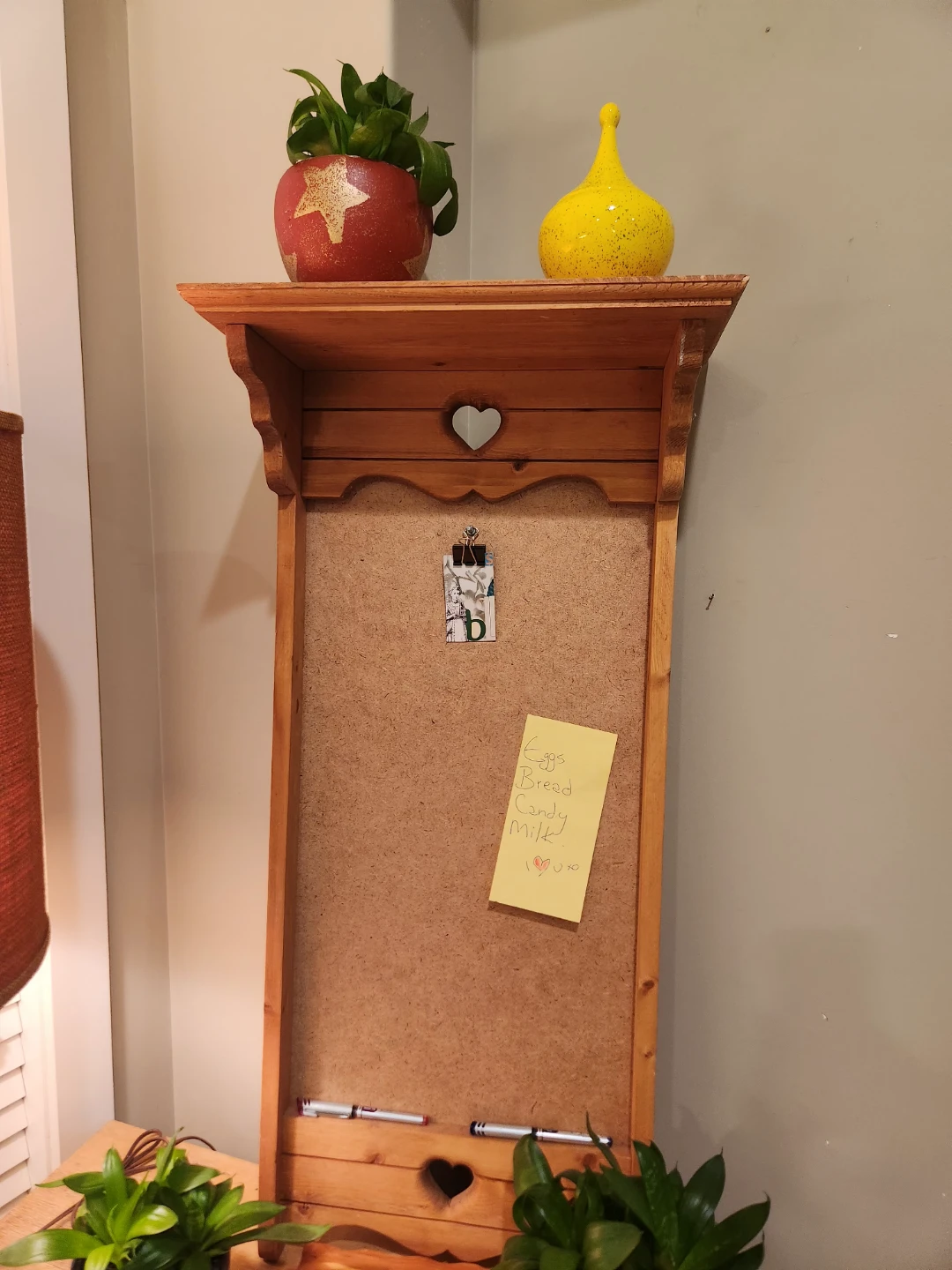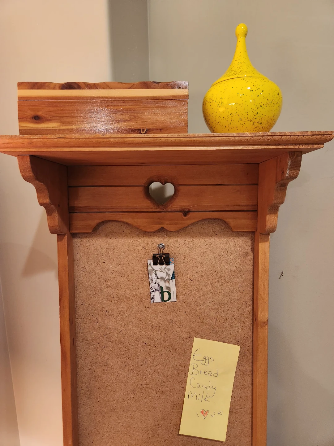 Super cute homemade wooden wall organizer with a little shelf on top! It has classic cottage core vibes with heart cutout details. Space to hold pens. Key peg and post it note surface. Top shelf display for plants or storage bssket is pretty and practical and perfect for keeping your notes and reminders organized! Shelf surface 17.5x8 organizer is 36 inches high.