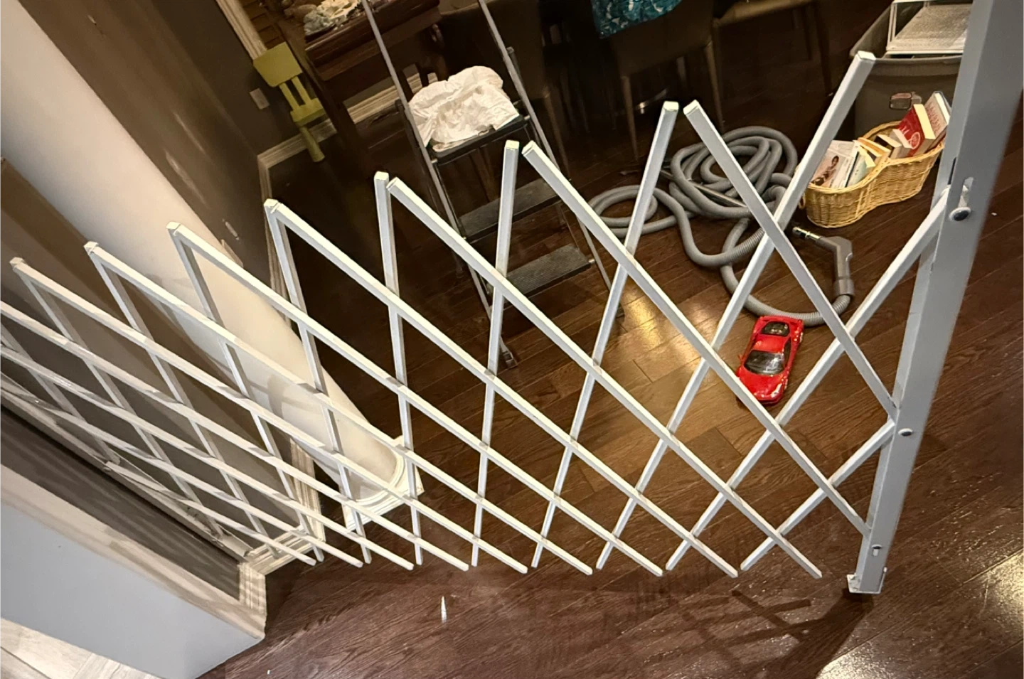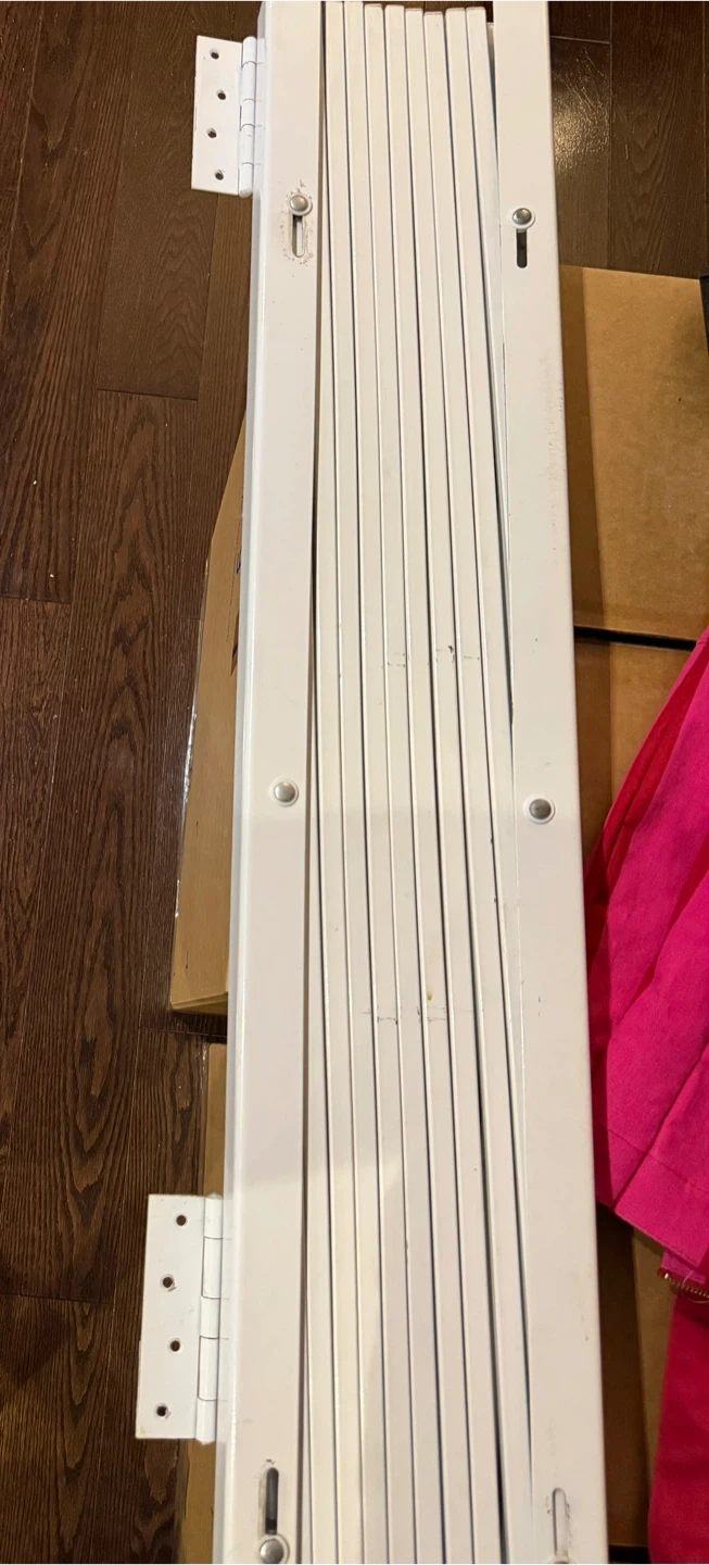 Expandable white metal gate. Wall mount style with wheels on one end. Great for stairs or wide openings. Extends 7.5-64 inches long 47.25 inches height