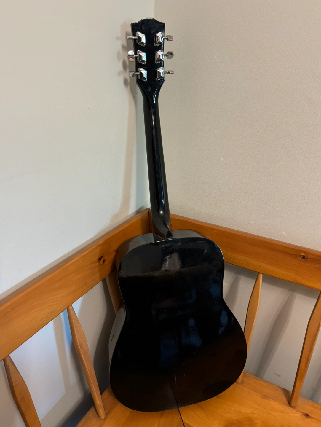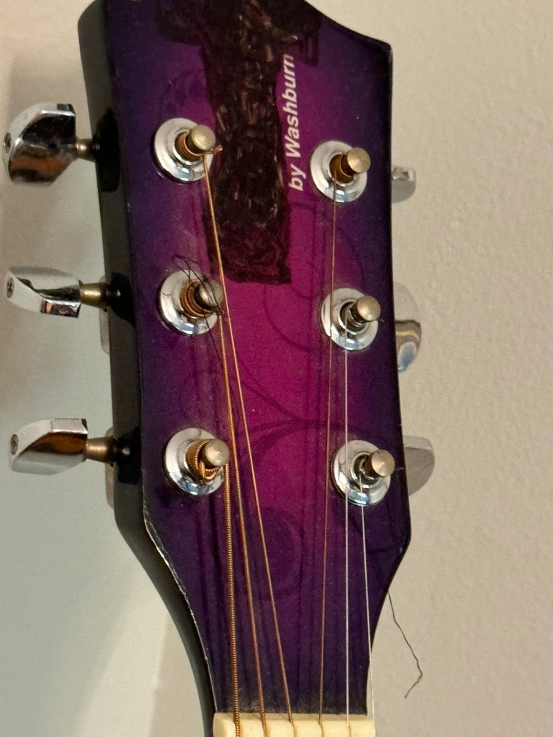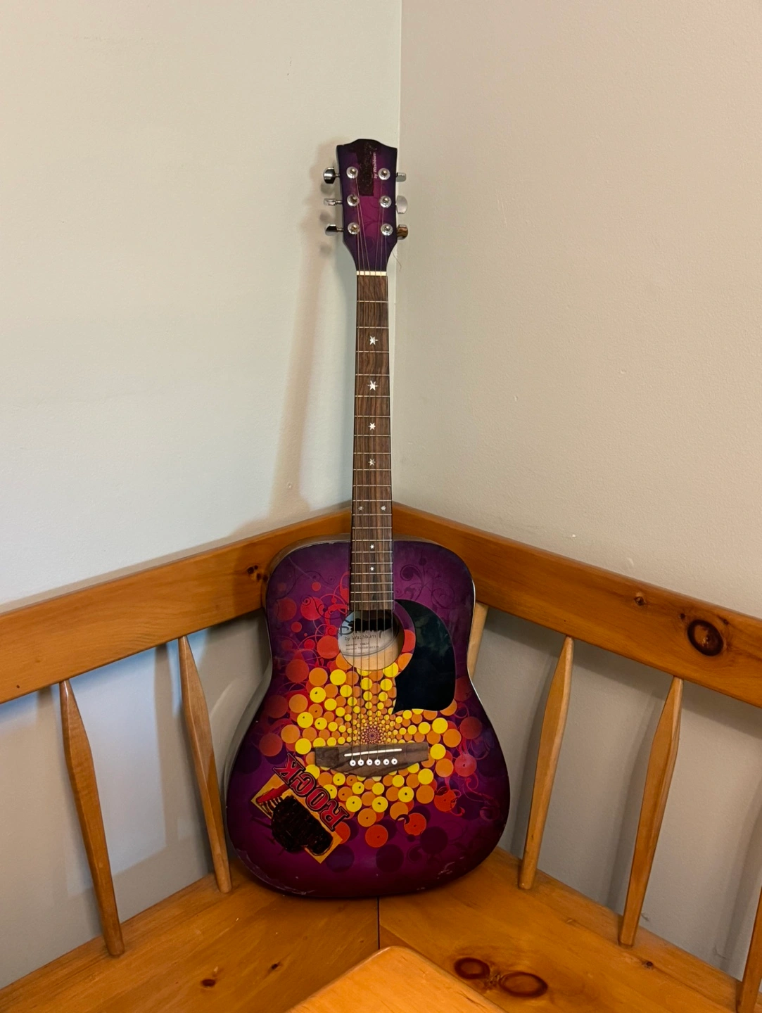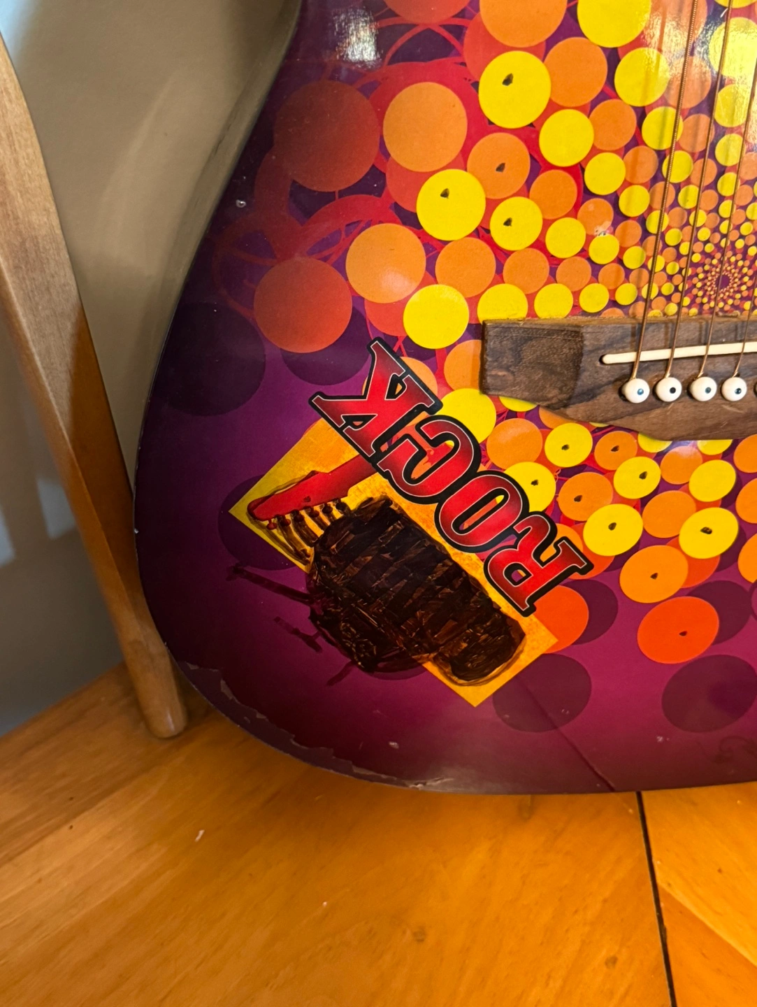 Purple and orange acoustic guitar. Has a 'Rock' design on the body.