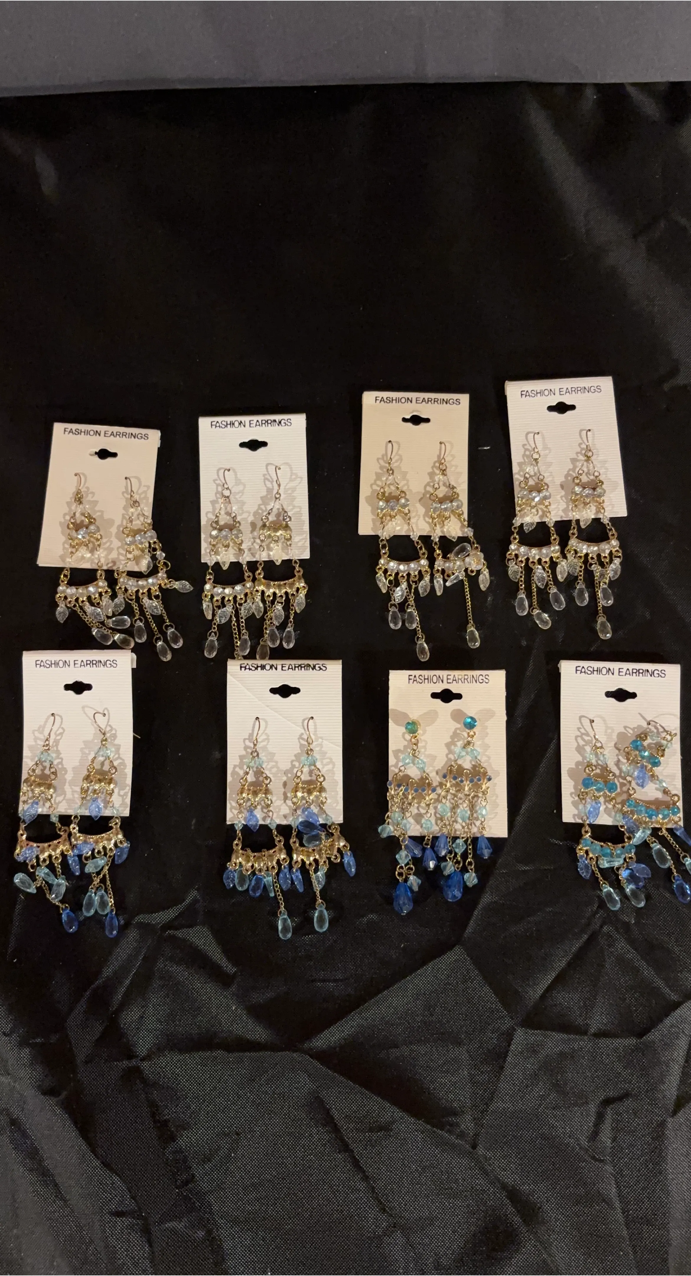 Set of fashion earrings featuring gold-tone metal. Some styles have clear accents, while others include blue and turquoise beads. All are dangle or chandelier style and come on original carding. They're beautiful statement pieces! Good for bridal party!! $5 each or all 8 for $25