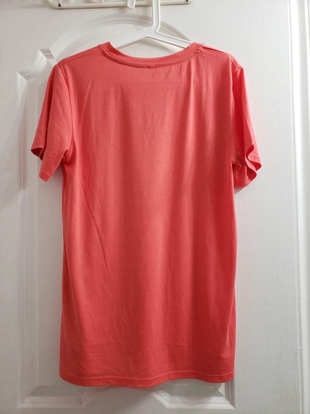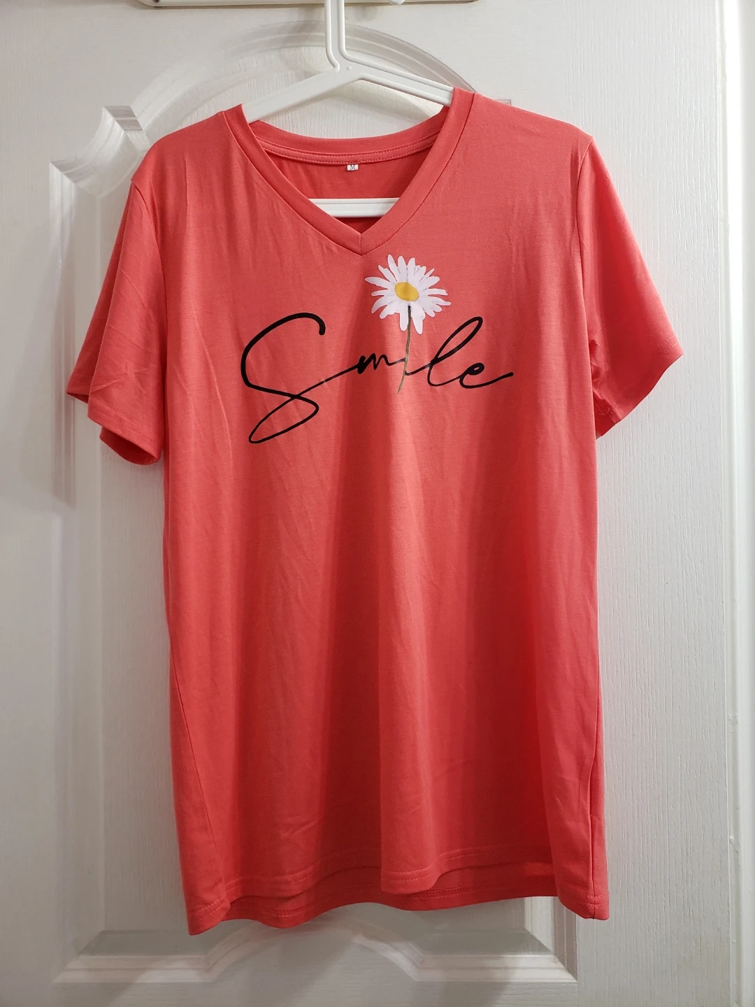 Coral v-neck t-shirt with a "Smile" graphic featuring a daisy. Short sleeves and a comfortable fit. Made of soft, breathable fabric.