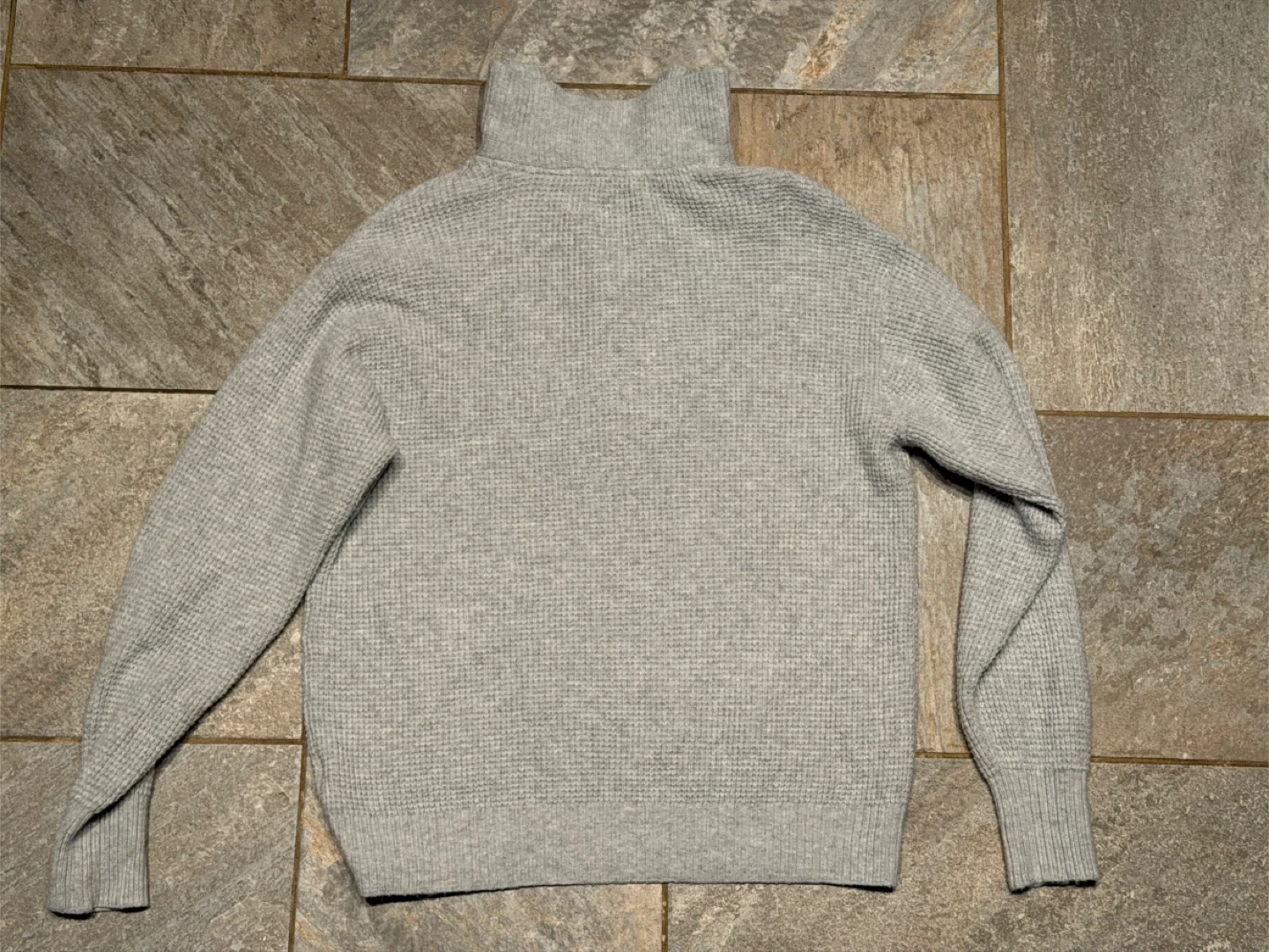 This is an Aerie grey waffle knit sweater. It's a size small with a collared neck and button details. Made from a comfortable knit material.