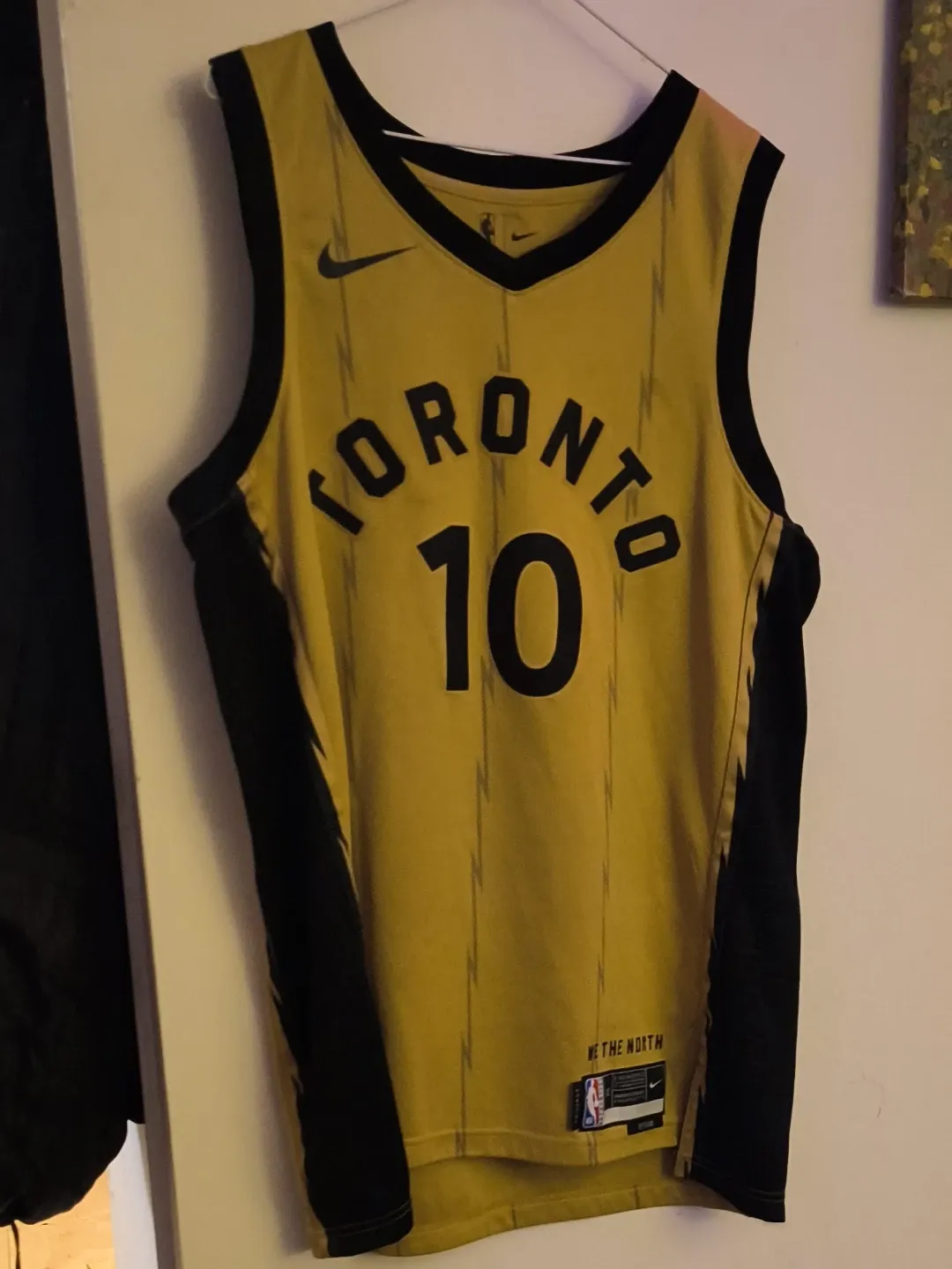 Nike Toronto Raptors basketball jersey with "Toronto" and number 10. Features the "We The North" slogan. Made from polyester.