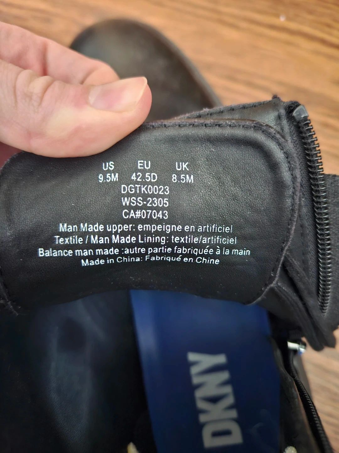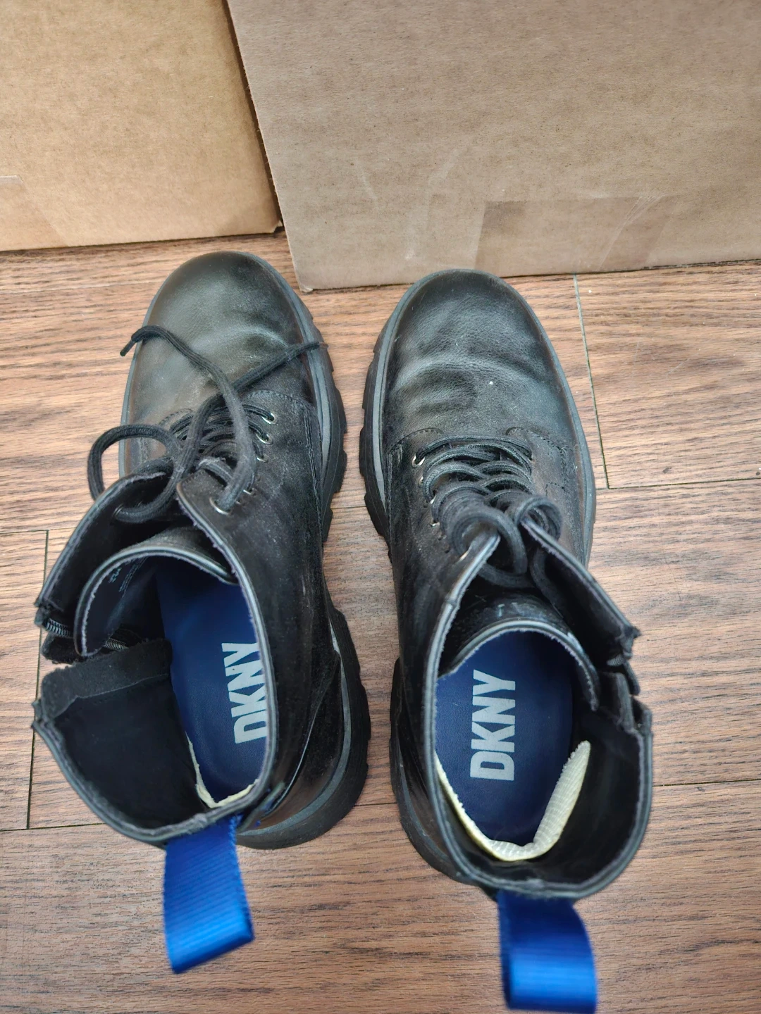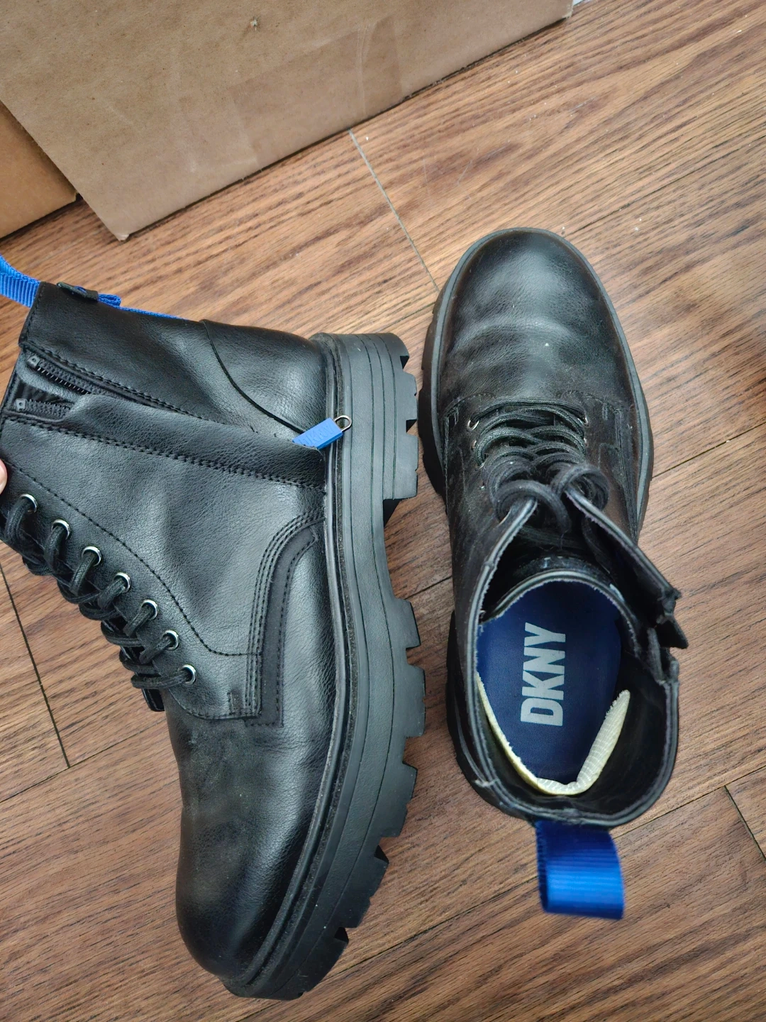 DKNY combat boots in black. US size 9.5M, EU size 42.5D, UK size 8.5M. Man-made upper, textile lining. Features a side zipper and blue pull tabs.