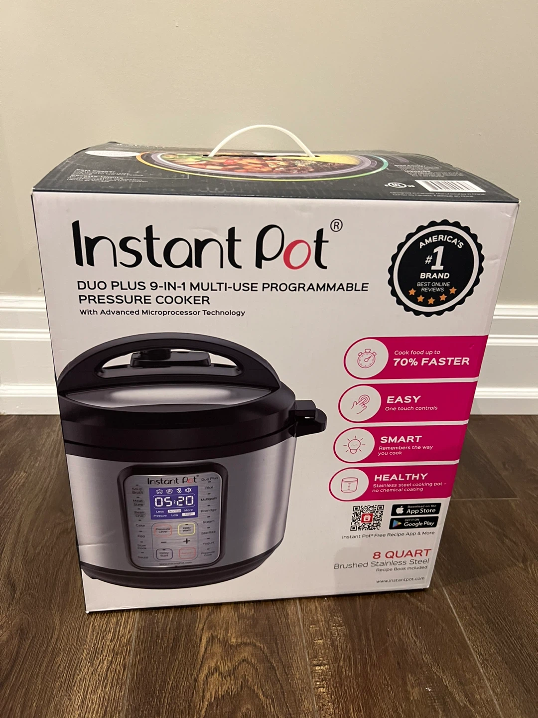 This Instant Pot Duo Plus is a 9-in-1 multi-use programmable pressure cooker. It's an 8 quart model with brushed stainless steel inner pot. It cooks food up to 70% faster and features one-touch controls.