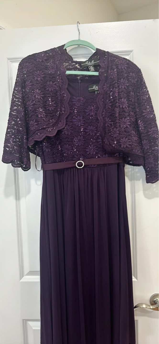 This R & M Richards dress features a purple lace sequined overlay on the bodice and a flowing chiffon skirt. It comes with a matching lace bolero jacket. Dress has a decorative belt with a crystal-look buckle.