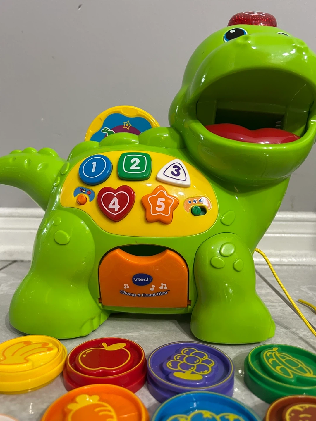 Check out this VTech Chomp & Count Dino! It's a fun interactive toy for little ones. Your kiddo can feed the dino the colourful discs and learn about numbers and food. It's in great shape and ready for a new home!