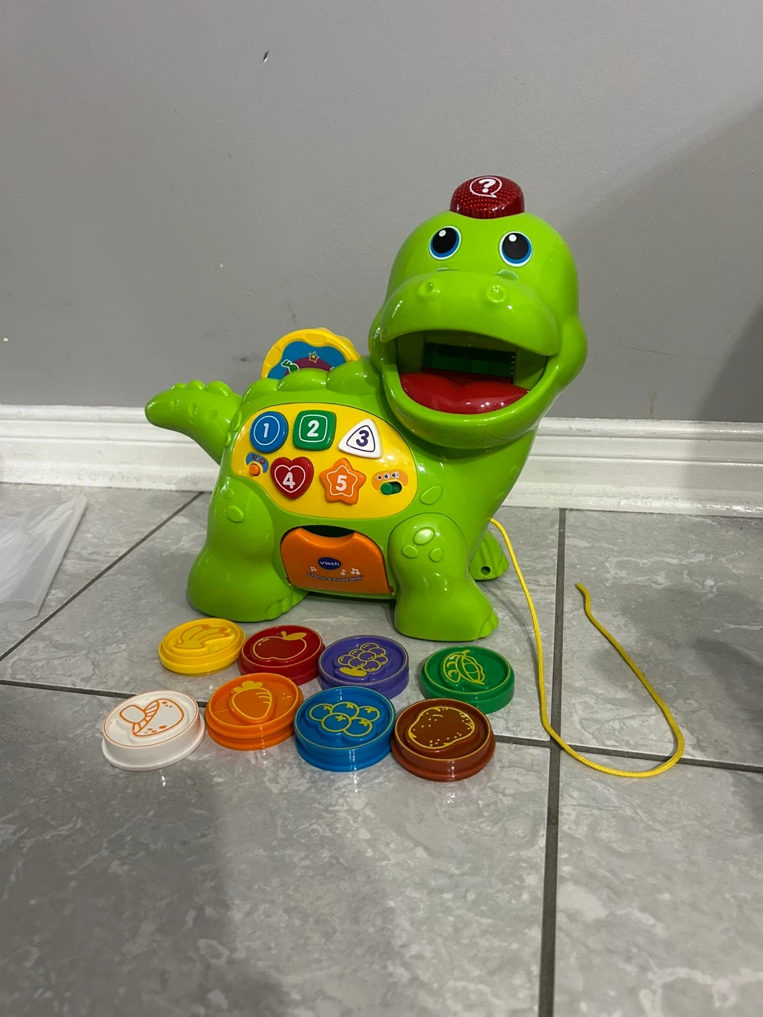 Check out this VTech Chomp & Count Dino! It's a fun interactive toy for little ones. Your kiddo can feed the dino the colourful discs and learn about numbers and food. It's in great shape and ready for a new home!