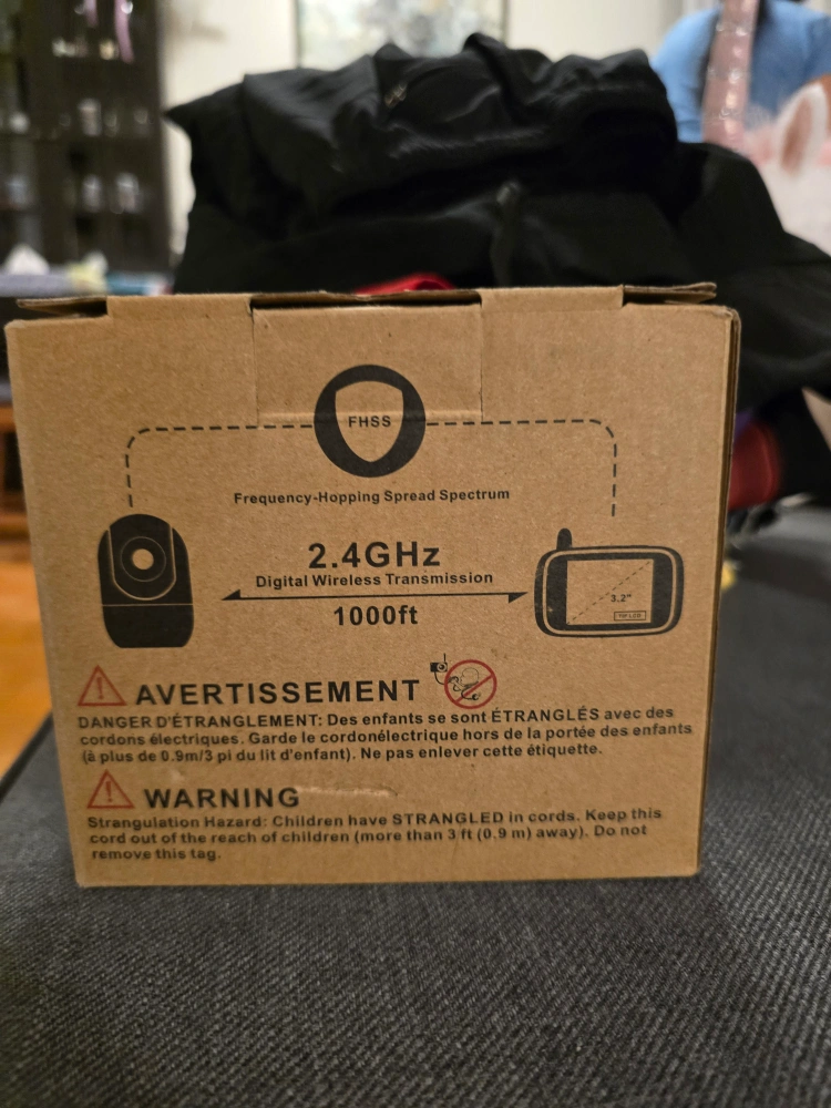 New in box. Includes camera and parent unit. Features a 3.2" TFT LCD screen. 1000ft range. FHSS frequency-hopping spread spectrum. Smart Eco Mode. White camera.