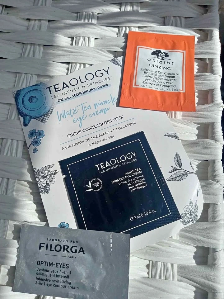 Teaology White Tea Miracle Eye Cream (3ml), Origins Ginzing Refreshing Eye Cream (1.5ml), and Filorga Optim-Eyes. Good way to try out these different brands.